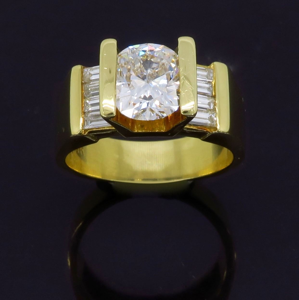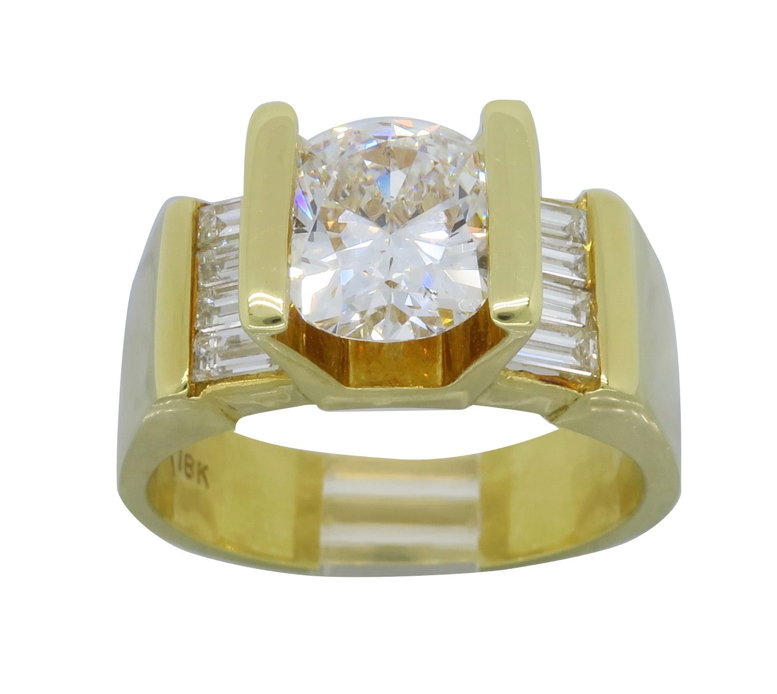 One 18KT Yellow Gold 2.01ctw Diamond Ring. (1) Oval cut center Diamond with a total weight of 1.49cts with a color of H-I and clarity of SI-1. Side baguette Diamonds with a total weight of 0.52cts.