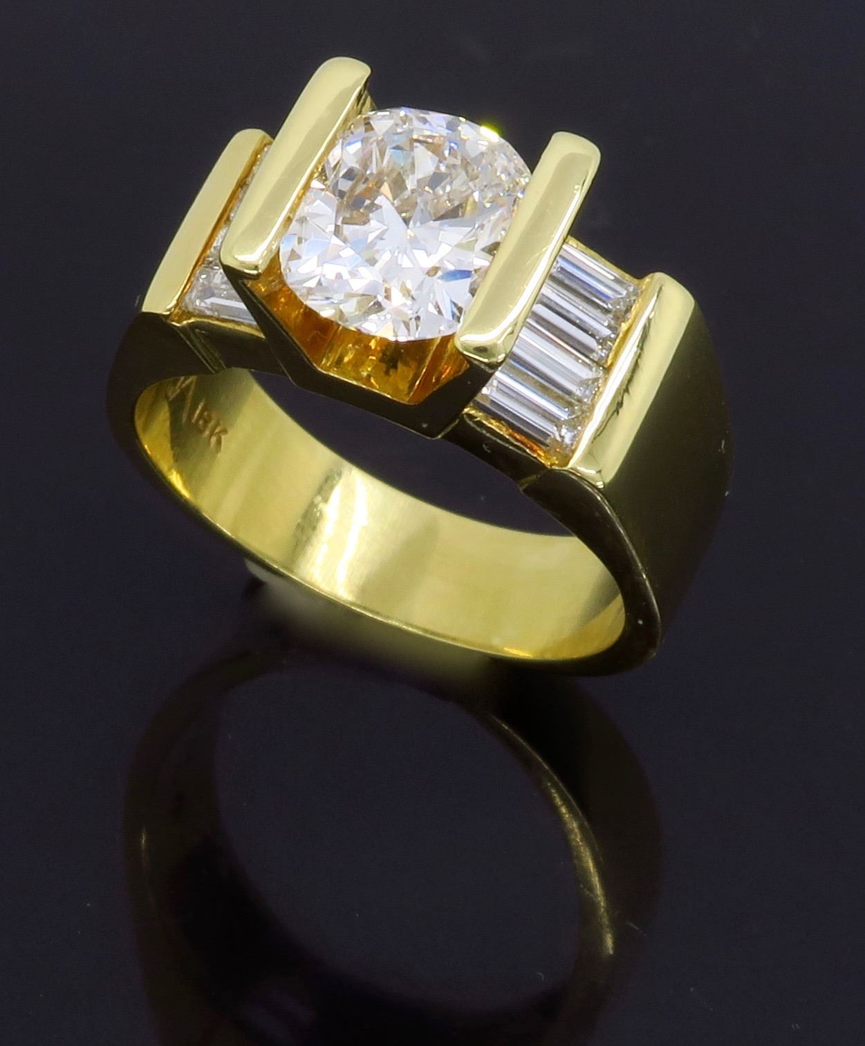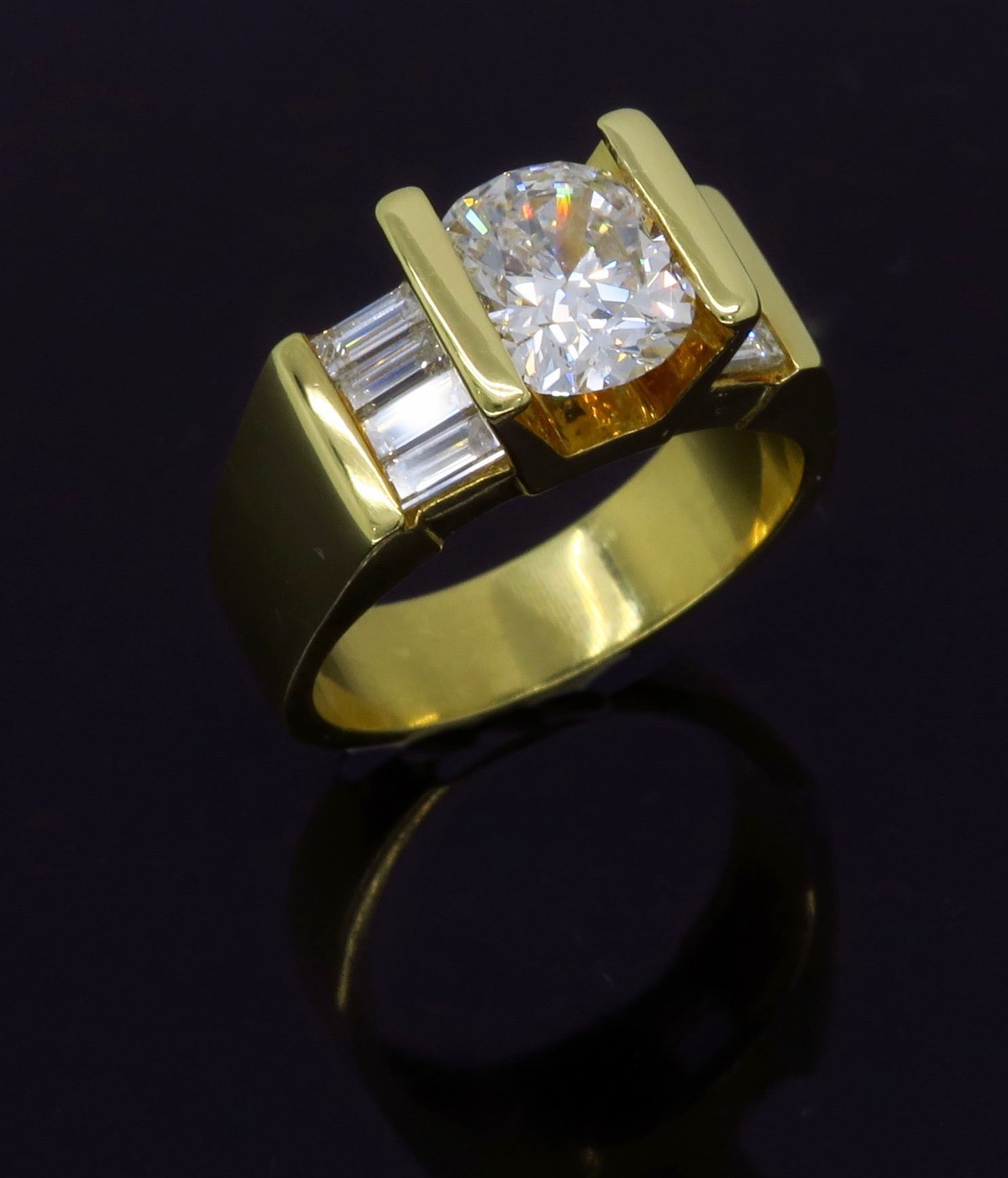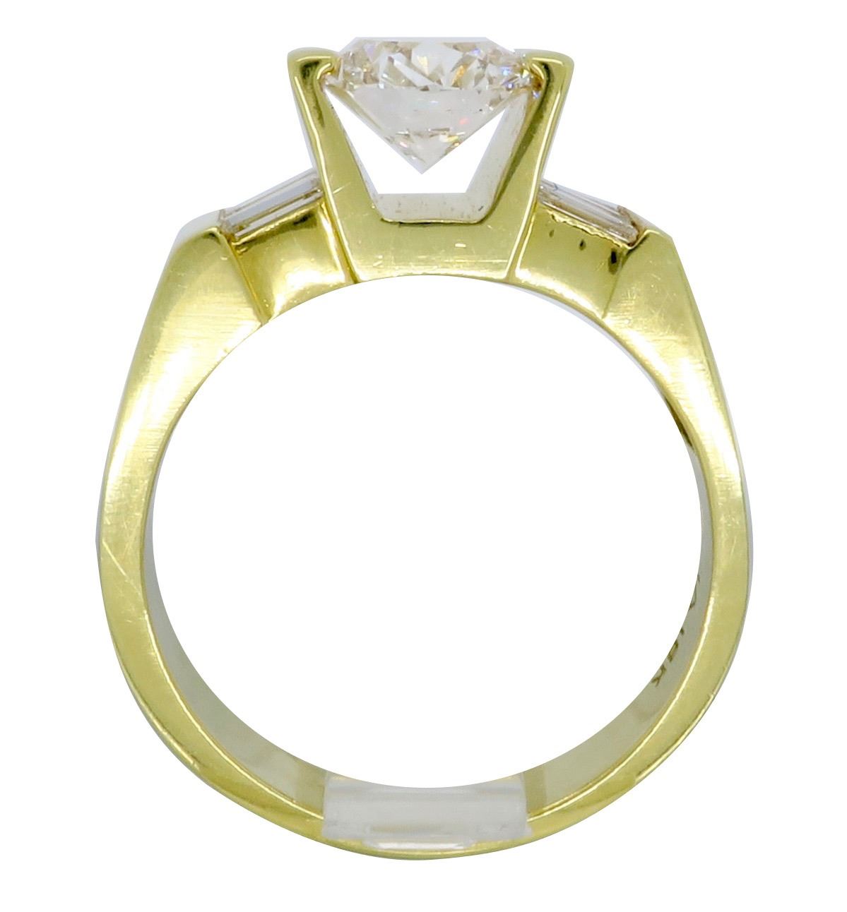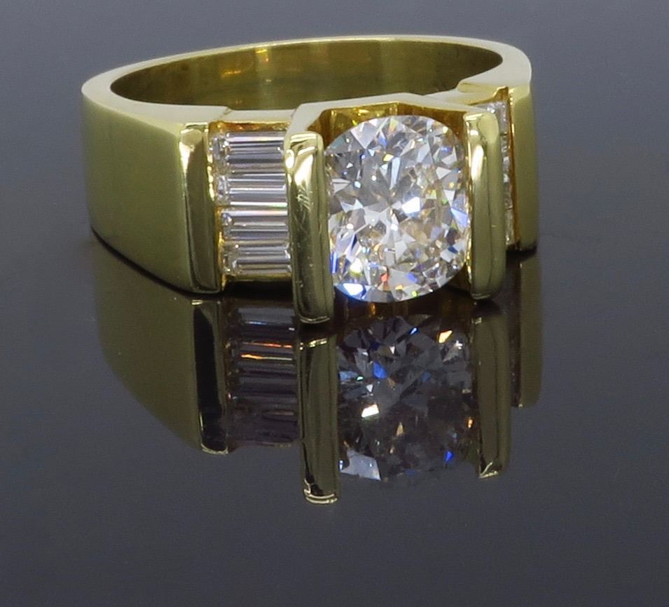 One 18KT Yellow Gold 2.01ctw Diamond Ring. (1) Oval cut center Diamond with a total weight of 1.49cts with a color of H-I and clarity of SI-1. Side baguette Diamonds with a total weight of 0.52cts.