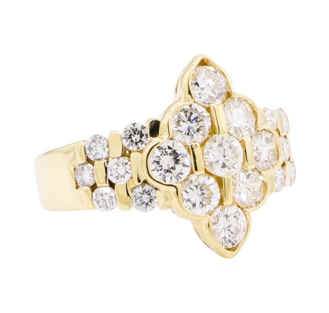 One electronically tested 18KT yellow gold lady's cast fashion ring with a bright polish finish. The featured lady's ring has a center diamond shaped motif and a shank measuring 2.90 millimeters wide. Identified with markings of 'K18'. Condition is new, good workmanship. Containing: Nine channel and prong set round brilliant cut diamonds, measuring 3.70 - 3.60 x 2.26mm (depth est.) approximate total weight of 9 Stones = 1.63ct. Graded in the setting. Color G - I, Clarity VS-2 to SI-1 Cut Good Twelve channel set round brilliant cut diamonds, measuring 2.10 - 2.00 x 1.27mm (depth est.) approximate total weight of 12 Stones = 0.40ct. Graded in the setting. Color G - H, Clarity VS-2 to SI-1, Cut Very Good. Total Weight of Diamonds 2.03ct. Total Weight of Ring 6.60gm. GAS Appraised.