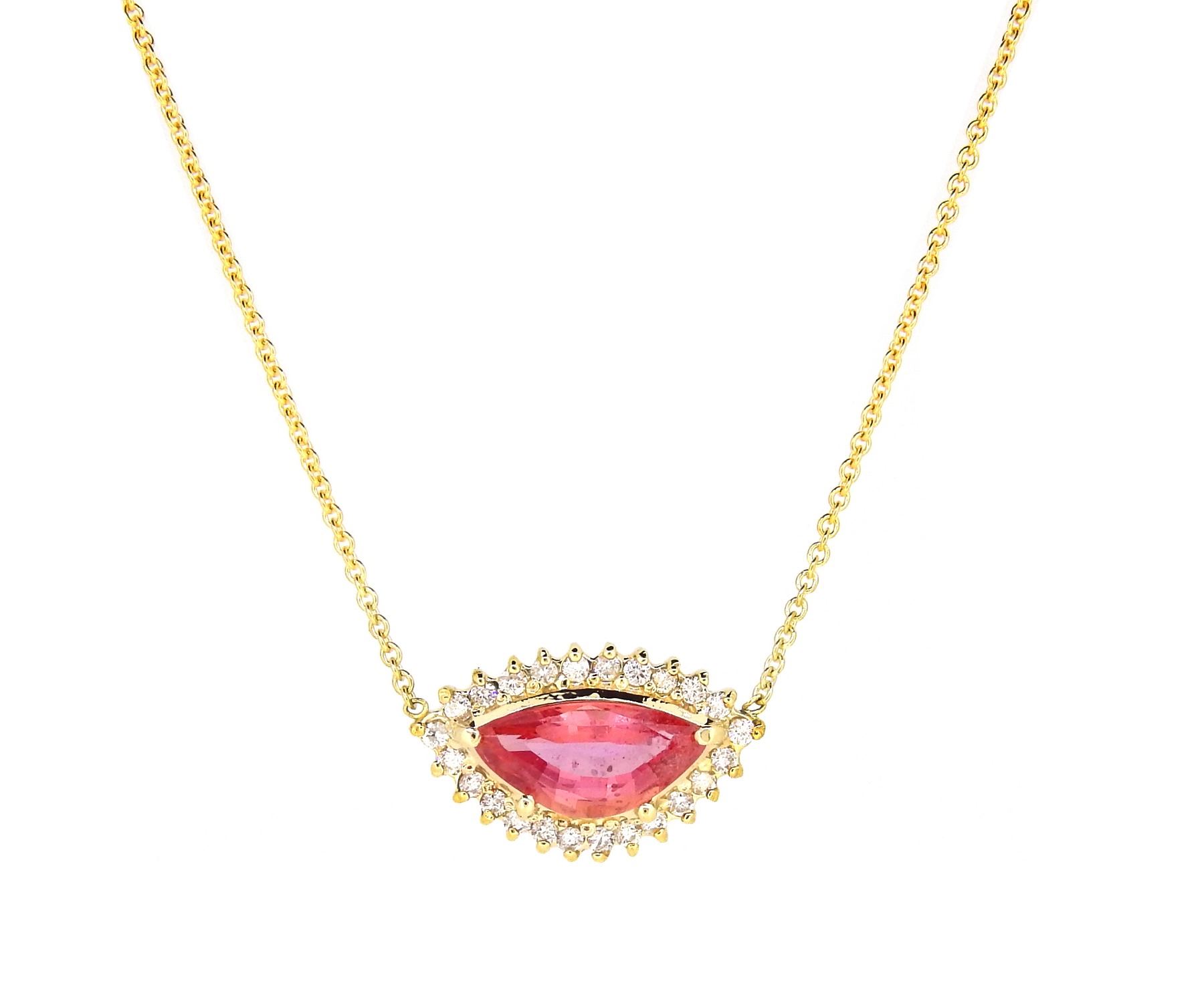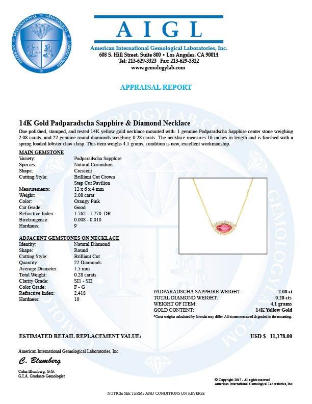 One 18KT Yellow Gold 2.08ct Padparadscha Sapphire and Diamond Pendant with Chain. (1) Padparadscha Sapphire with a total weight of 2.08cts. (24) Diamonds with a total weight of 0.28cts with a color of F-G and clarity of SI-1 to SI-2. Total weight of this pendant with chain is 4.1 grams.