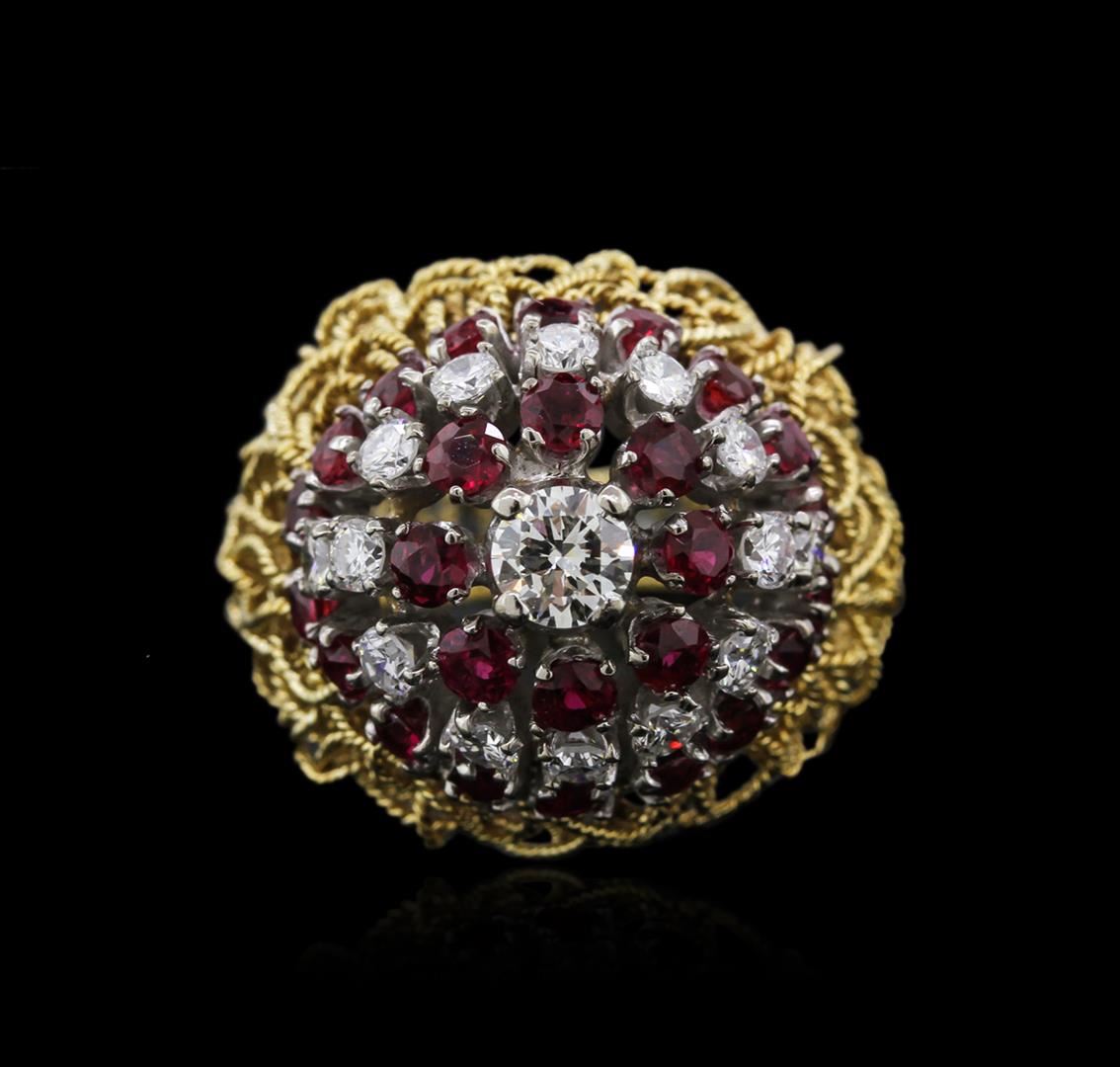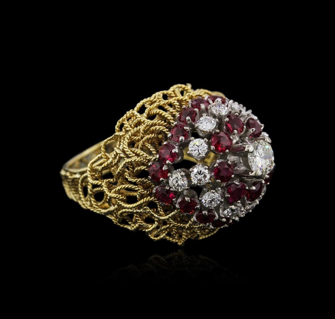 One electronically tested 18KT yellow gold ladies cast ruby and diamond ring. Identified with markings of "18K". Condition is very good. Containing: Twenty-six prong set round modified brilliant cut natural rubies, measuring 2.50 - 2.50 x 1.63 mm, approximate total weight of 2.08ct., clarity is slightly included, medium, moderately strong, slightly purplish red color, (GIA slpR 5/4), cut is good. One prong set round brilliant cut diamond, measuring 4.50 - 4.50 x 2.70mm (depth est.) approximate weight of 0.33ct. Clarity: VS-2. Color: J, Cut is Good. Fourteen prong set round brilliant cut diamonds, measuring 2.50 - 2.50 x 1.50mm (depth est.) approximate total weight of 14 Stones = 0.80ct. Clarity: SI-1 to SI-2. Color: I - J, Cut is Good. Diamonds and colored gemstones are graded in the mounting, unless otherwise stated. Colored gemstones are presumed to have been subjected to commonly used enhancement processes. Total Weight of Colored Stones 2.08ct. Total Weight of Diamonds 1.13ct. Total Weight of Ring 10.60 grams. GGL Appraised at $4,970.00.