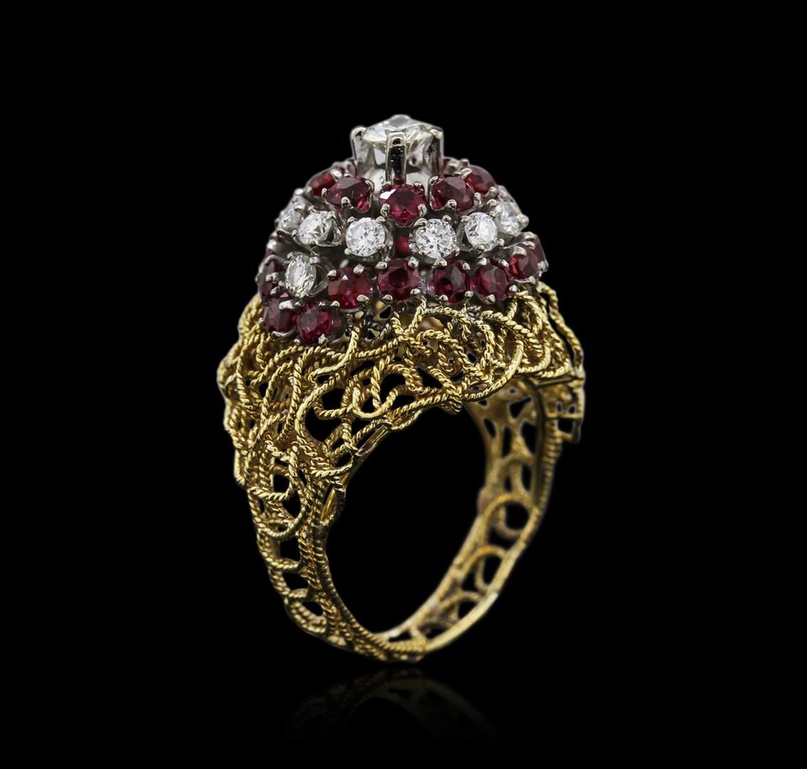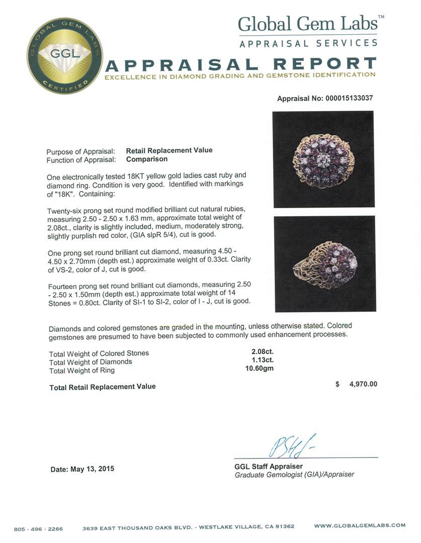One electronically tested 18KT yellow gold ladies cast ruby and diamond ring. Identified with markings of "18K". Condition is very good. Containing: Twenty-six prong set round modified brilliant cut natural rubies, measuring 2.50 - 2.50 x 1.63 mm, approximate total weight of 2.08ct., clarity is slightly included, medium, moderately strong, slightly purplish red color, (GIA slpR 5/4), cut is good. One prong set round brilliant cut diamond, measuring 4.50 - 4.50 x 2.70mm (depth est.) approximate weight of 0.33ct. Clarity: VS-2. Color: J, Cut is Good. Fourteen prong set round brilliant cut diamonds, measuring 2.50 - 2.50 x 1.50mm (depth est.) approximate total weight of 14 Stones = 0.80ct. Clarity: SI-1 to SI-2. Color: I - J, Cut is Good. Diamonds and colored gemstones are graded in the mounting, unless otherwise stated. Colored gemstones are presumed to have been subjected to commonly used enhancement processes. Total Weight of Colored Stones 2.08ct. Total Weight of Diamonds 1.13ct. Total Weight of Ring 10.60 grams. GGL Appraised at $4,970.00.