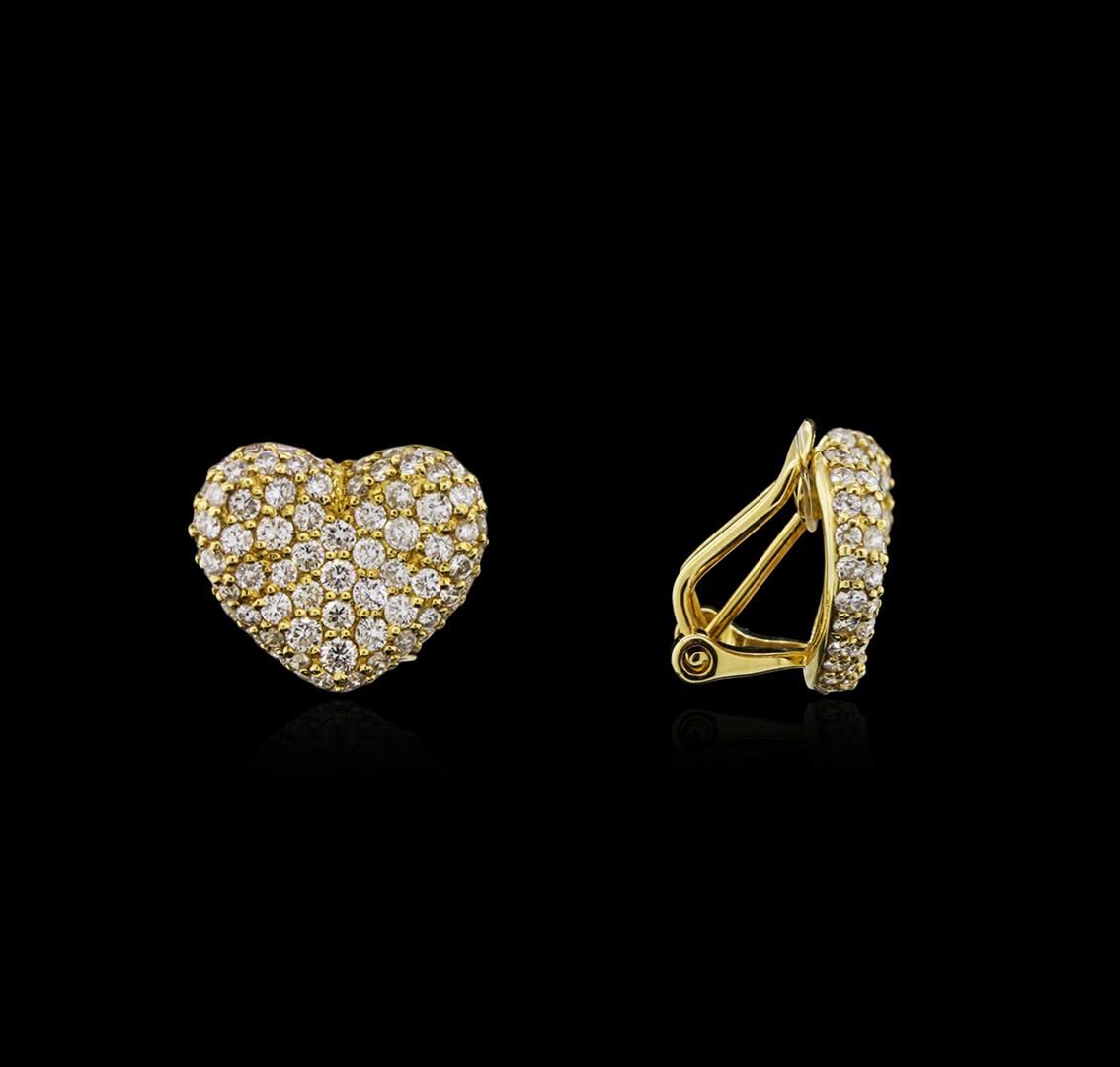 One pair electronically tested 18KT yellow gold ladies cast diamond earrings with Omega clip backs with a bright polish finish. Identified with markings of "K18". Condition is new. Containing: One Hundred Fifty prong set round brilliant cut diamonds, measuring 1.70 - 1.50 x 0.96mm (depth est.) approximate total weight of 150 Stones = 2.24ct. Clarity: SI-1 to SI-2. Color: F - G, Cut is Good. Diamonds are graded in the mounting, unless otherwise stated. Total Weight of Diamonds 2.24ct. Total Weight of Earrings 5.00 grams. GGL Appraised at $5,960.00.