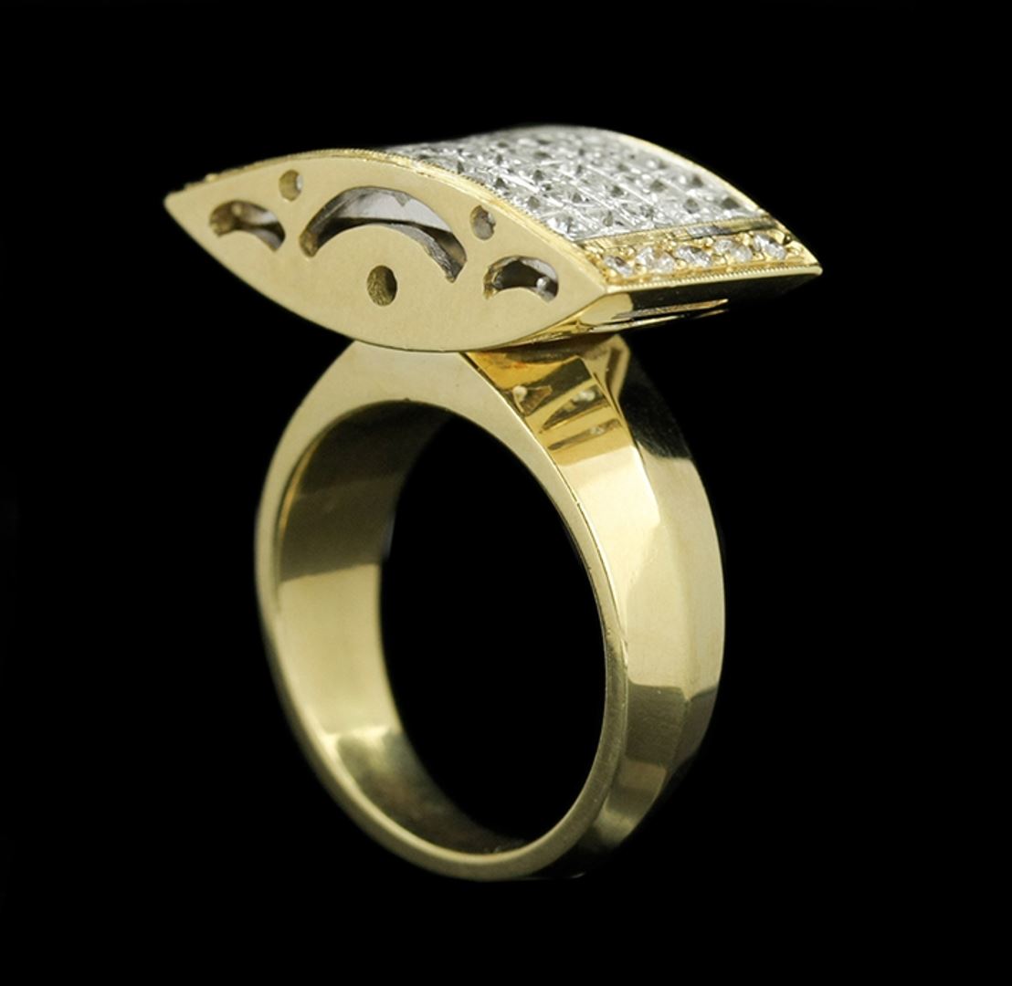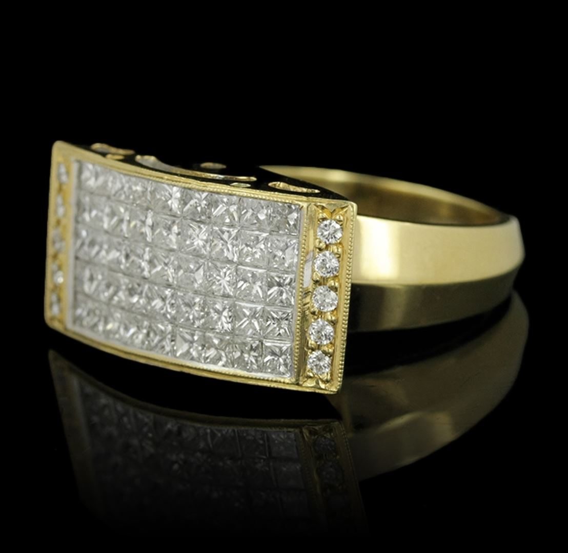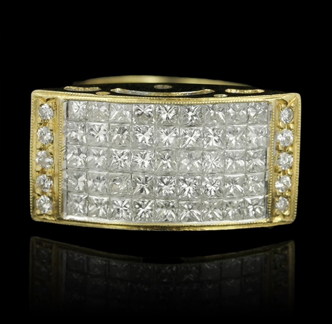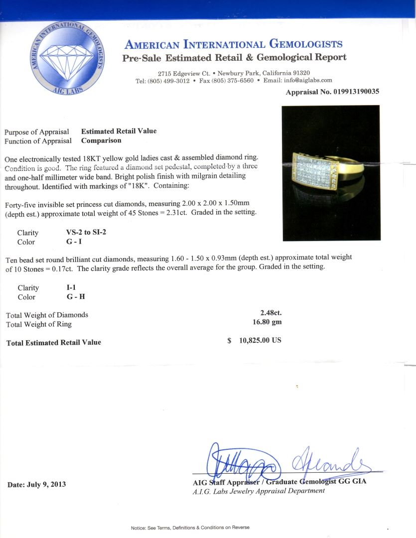 One electronically tested 18KT yellow gold ladies cast and assembled diamond ring. Condition is good. The ring features a diamond set pedestal, completed by a three and one half millimeter wide band. Bright polish finish with milgrain detailing throughout. Identified with markings if "18K". Containing: Forty five invisible set princess cut diamonds, measuring 2.00 x 2.00 x 1.50mm(depth est.) approximate total weight of 45 stones = 2.31 Graded in the setting. Clarity VS-2 to SI-2. Color G - I. Ten bead set round brilliant cut diamonds, measuring 1.60 - 1.50 x 0.93mm (depth est.) approximate total weight of 10 stones = 0.17ct. The clarity grade reflects the overall average for the group. Graded in the setting. Clarity I-1. Color G - H. Total weight of diamonds 2.48ct. Total weight of ring 16.80gm. AIG Appraised at $10,825.00.
