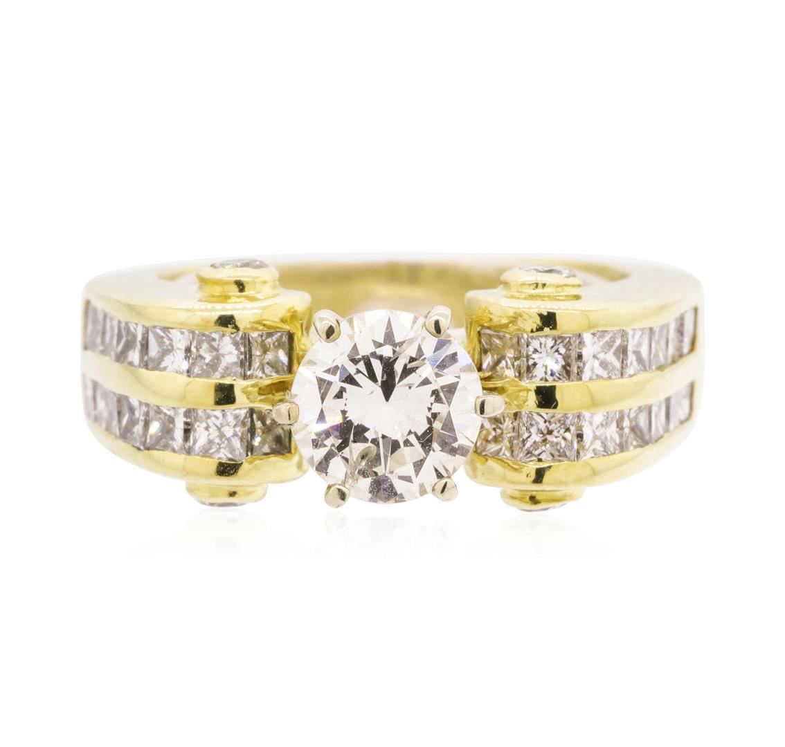 One electronically tested 18KT yellow gold Ladies combination cast & assembled wedding ring with a double row raised shoulders motif with a bright polish finish. The featured Ladies ring has a shank measuring 4.00 millimeters wide. Identified with markings of '18K'. Condition is like new, good workmanship. Containing: One prong set round brilliant cut diamond, measuring 6.40 - 6.35 x 4.05mm (depth est.) approximate weight of 1.03ct. Graded in the setting. Color H - I Clarity I-1 Cut Good Twenty-Eight channel set princess cut diamonds, measuring 2.00 x 2.00 x 1.50mm (depth est.) approximate total weight of 28 Stones = 1.38ct. Graded in the setting. Color H - I Clarity VS-2 to SI-1 Cut Good Four bezel set round brilliant cut diamonds, measuring 2.10 - 2.00 x 1.27mm (depth est.) approximate total weight of 4 Stones = 0.13ct. Graded in the setting. Color G - H Clarity SI-1 to SI-2 Cut Good. Total Weight of Diamonds 2.54ct. Total Weight of Ring 9.80gm. GAS Appraised.