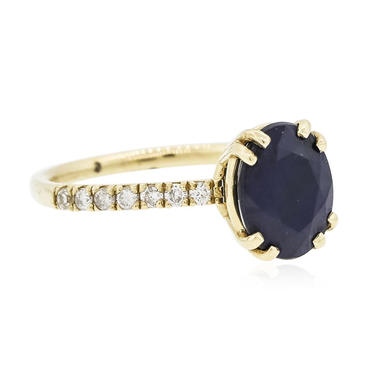 One electronically tested 18KT yellow gold ladies cast dyed sapphire and diamond ring with a bright polish finish. Condition is new, good workmanship. The featured dyed sapphire is supported by diamond set shoulders, completed by a one and one-half millimeter wide band. Identified with markings of "18K". Containing: One prong set oval mixed cut natural dyed sapphire, measuring 9.00 x 7.00 x 4.85mm, 8%. bulge factor, approximate weight of 2.68ct., clarity is severely included, dark, very slightly grayish, violetish blue color, (GIA vB 7/3), cut is good. Transmitting light very diffusely, opaque. Naturally occurring internal & external characteristics are present. Indications of multiple laboratory enhancements, including high temperature heat treatment and dye. Graded in the setting. Fourteen prong set round brilliant cut diamonds, measuring 1.70 - 1.60 x 0.99mm (depth est.) approximate. Total Weight of 14 Stones = 0.33ct. Graded in the setting. Clarity: SI-1 to I-1. Color: G - I. Total Weight of Colored Stones 2.68ct. Total Weight of Diamonds 0.33ct. Total Weight of Ring 2.46 grams. AIG Appraised at $1,555.00.
