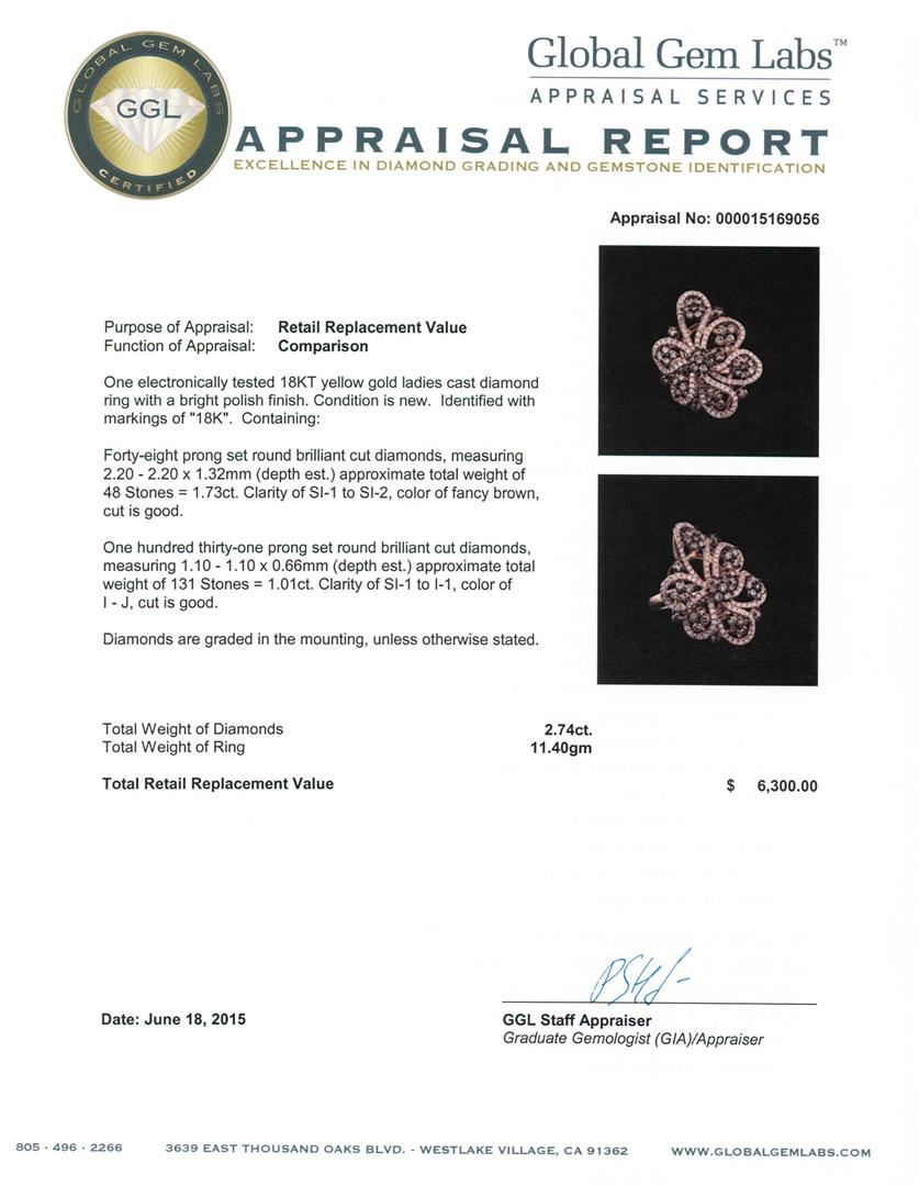 One electronically tested 18KT yellow gold ladies cast diamond ring with a bright polish finish. Identified with markings of "18K". Condition is new. Containing: Forty-Eight prong set round brilliant cut diamonds, measuring 2.20 - 2.20 x 1.32mm (depth est.) approximate total weight of 48 Stones = 1.73ct. Clarity: SI-1 to SI-2, Cut is Good. One Hundred Thirty-One prong set round brilliant cut diamonds, measuring 1.10 - 1.10 x 0.66mm (depth est.) approximate total weight of 131 Stones = 1.01ct. Clarity: SI-1 to I-1. Color: I - J, Cut is Good. Diamonds are graded in the mounting, unless otherwise stated. Total Weight of Diamonds 2.74ct. Total Weight of Ring 11.40 grams. GGL Appraised at $6,300.00.