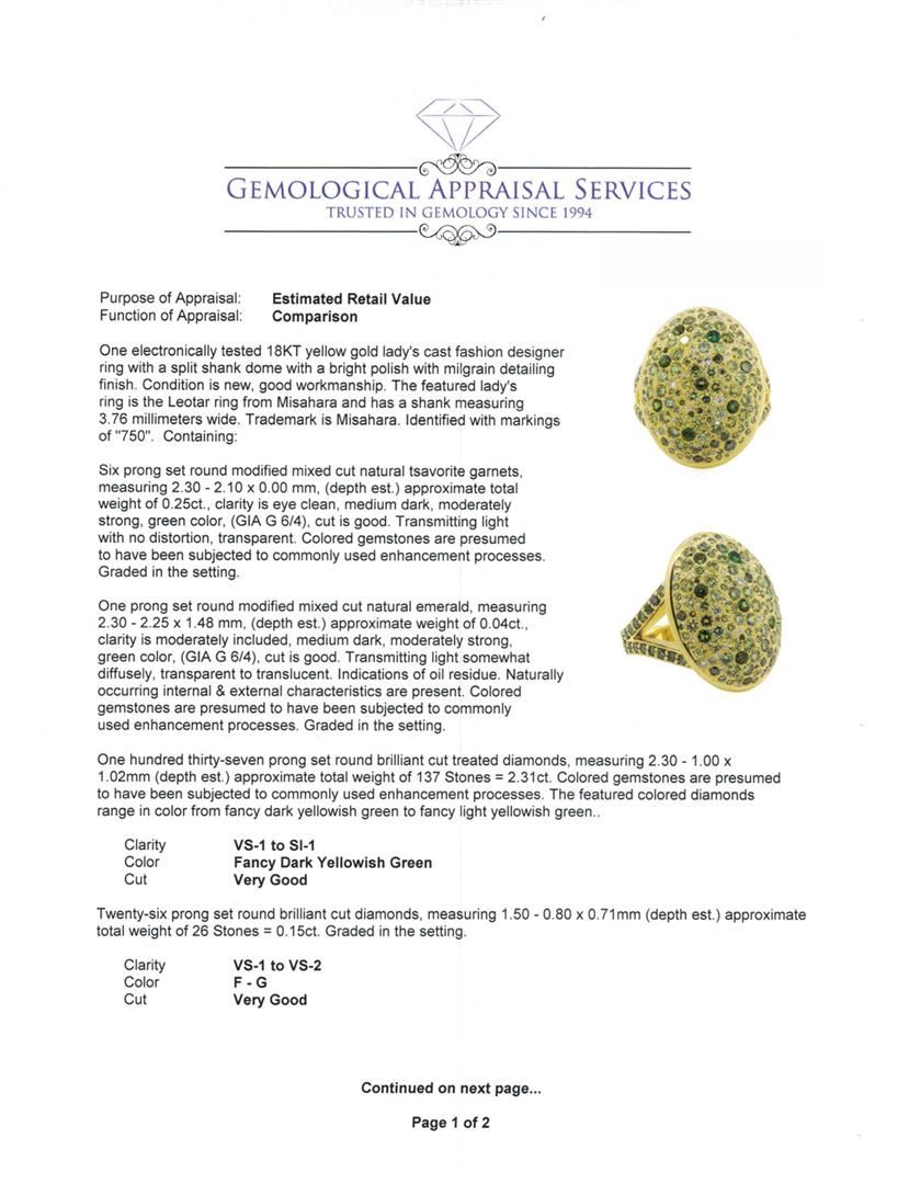One electronically tested 18KT yellow gold lady's cast fashion designer ring with a split shank dome with a bright polish with milgrain detailing finish. The featured lady's ring is the Leotar ring from Misahara and has a shank measuring 3.76 millimeters wide. Trademark is Misahara. Identified with markings of '750'. Condition is new, good workmanship. Containing: Six prong set round modified mixed cut natural tsavorite garnets, measuring 2.30 - 2.10 x 0.00 mm, (depth est.) approximate total weight of 0.25ct., clarity is eye clean, medium dark, moderately strong, green color, (GIA G 6/4), cut is good. Transmitting light with no distortion, transparent. Colored gemstones are presumed to have been subjected to commonly used enhancement processes. Graded in the setting. One prong set round modified mixed cut natural emerald, measuring 2.30 - 2.25 x 1.48 mm, (depth est.) approximate weight of 0.04ct., clarity is moderately included, medium dark, moderately strong, green color, (GIA G 6/4), cut is good. Transmitting light somewhat diffusely, transparent to translucent. Indications of oil residue. Naturally occurring internal & external characteristics are present. Colored gemstones are presumed to have been subjected to commonly used enhancement processes. Graded in the setting. One Hundred Thirty-Seven prong set round brilliant cut treated diamonds, measuring 2.30 - 1.00 x 1.02mm (depth est.) approximate total weight of 137 Stones = 2.31ct. Colored gemstones are presumed to have been subjected to commonly used enhancement processes. The featured colored diamonds range in color from fancy dark yellowish green to fancy light yellowish green. Color Fancy Dark Yellowish Green Clarity VS-1 to SI-1 Cut Very Good Twenty-Six prong set round brilliant cut diamonds, measuring 1.50 - 0.80 x 0.71mm (depth est.) approximate total weight of 26 Stones = 0.15ct. Graded in the setting. Color F - G Clarity VS-1 to VS-2 Cut Very Good Three prong set round modified mixed cut natural tsavorite garnets, measuring 1.20 - 1.10 x 0.75 mm, (depth est.) approximate total weight of 0.03ct., clarity is eye clean, medium dark, moderately strong, green color, (GIA G 6/4), cut is good. Transmitting light with no distortion, transparent. Colored gemstones are presumed to have been subjected to commonly used enhancement processes. Graded in the setting. Total Weight of Colored Stones 0.32ct. Total Weight of Diamonds 2.46ct. Total Weight of Ring 18.80gm. GAS Appraised.