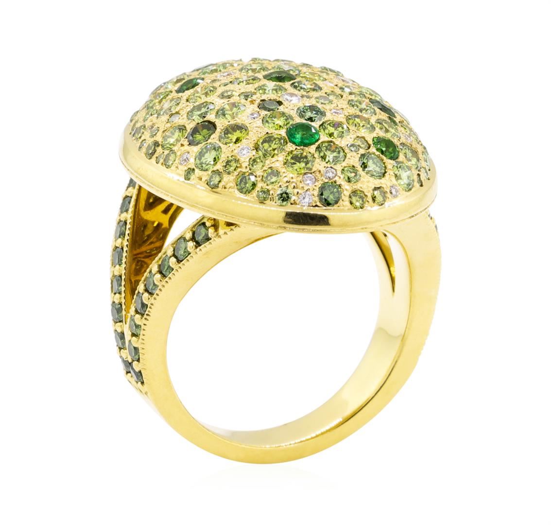 One electronically tested 18KT yellow gold lady's cast fashion designer ring with a split shank dome with a bright polish with milgrain detailing finish. The featured lady's ring is the Leotar ring from Misahara and has a shank measuring 3.76 millimeters wide. Trademark is Misahara. Identified with markings of '750'. Condition is new, good workmanship. Containing: Six prong set round modified mixed cut natural tsavorite garnets, measuring 2.30 - 2.10 x 0.00 mm, (depth est.) approximate total weight of 0.25ct., clarity is eye clean, medium dark, moderately strong, green color, (GIA G 6/4), cut is good. Transmitting light with no distortion, transparent. Colored gemstones are presumed to have been subjected to commonly used enhancement processes. Graded in the setting. One prong set round modified mixed cut natural emerald, measuring 2.30 - 2.25 x 1.48 mm, (depth est.) approximate weight of 0.04ct., clarity is moderately included, medium dark, moderately strong, green color, (GIA G 6/4), cut is good. Transmitting light somewhat diffusely, transparent to translucent. Indications of oil residue. Naturally occurring internal & external characteristics are present. Colored gemstones are presumed to have been subjected to commonly used enhancement processes. Graded in the setting. One Hundred Thirty-Seven prong set round brilliant cut treated diamonds, measuring 2.30 - 1.00 x 1.02mm (depth est.) approximate total weight of 137 Stones = 2.31ct. Colored gemstones are presumed to have been subjected to commonly used enhancement processes. The featured colored diamonds range in color from fancy dark yellowish green to fancy light yellowish green. Color Fancy Dark Yellowish Green Clarity VS-1 to SI-1 Cut Very Good Twenty-Six prong set round brilliant cut diamonds, measuring 1.50 - 0.80 x 0.71mm (depth est.) approximate total weight of 26 Stones = 0.15ct. Graded in the setting. Color F - G Clarity VS-1 to VS-2 Cut Very Good Three prong set round modified mixed cut natural tsavorite garnets, measuring 1.20 - 1.10 x 0.75 mm, (depth est.) approximate total weight of 0.03ct., clarity is eye clean, medium dark, moderately strong, green color, (GIA G 6/4), cut is good. Transmitting light with no distortion, transparent. Colored gemstones are presumed to have been subjected to commonly used enhancement processes. Graded in the setting. Total Weight of Colored Stones 0.32ct. Total Weight of Diamonds 2.46ct. Total Weight of Ring 18.80gm. GAS Appraised.