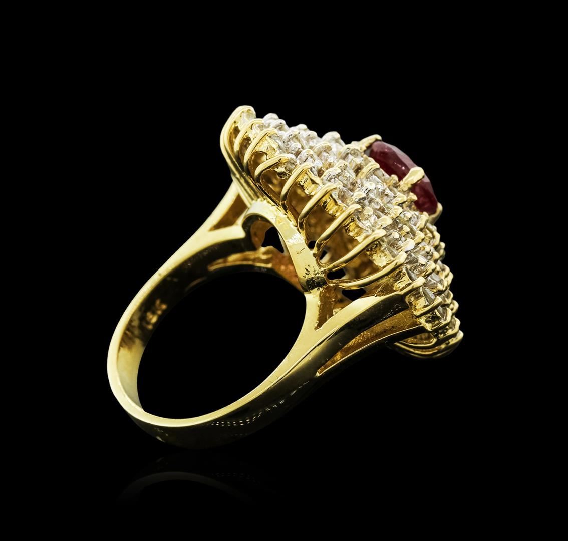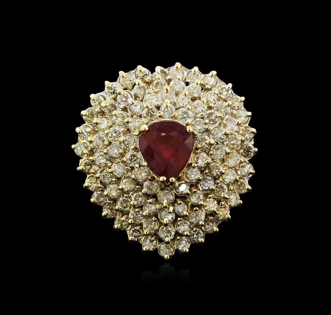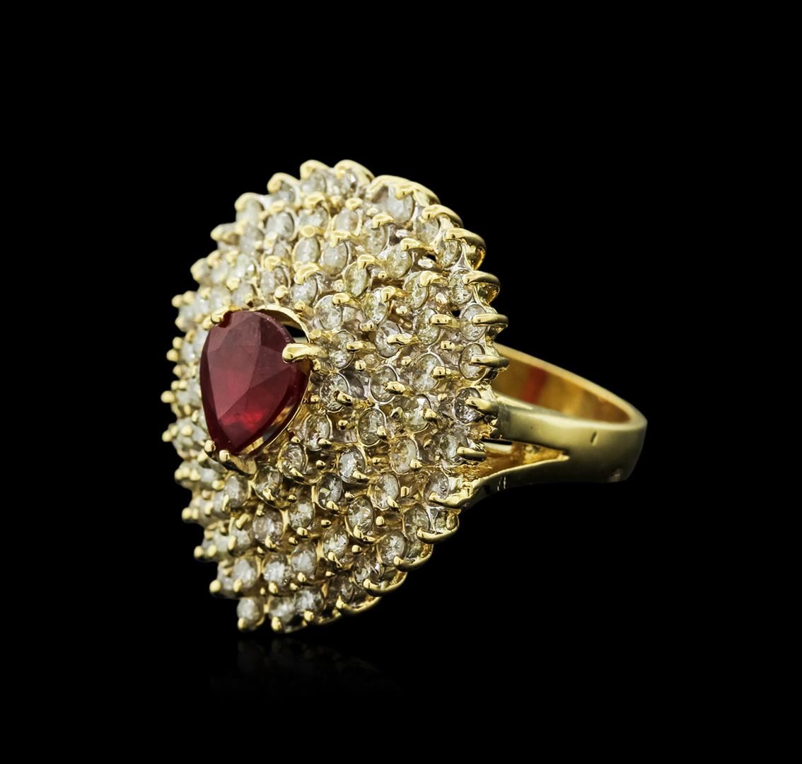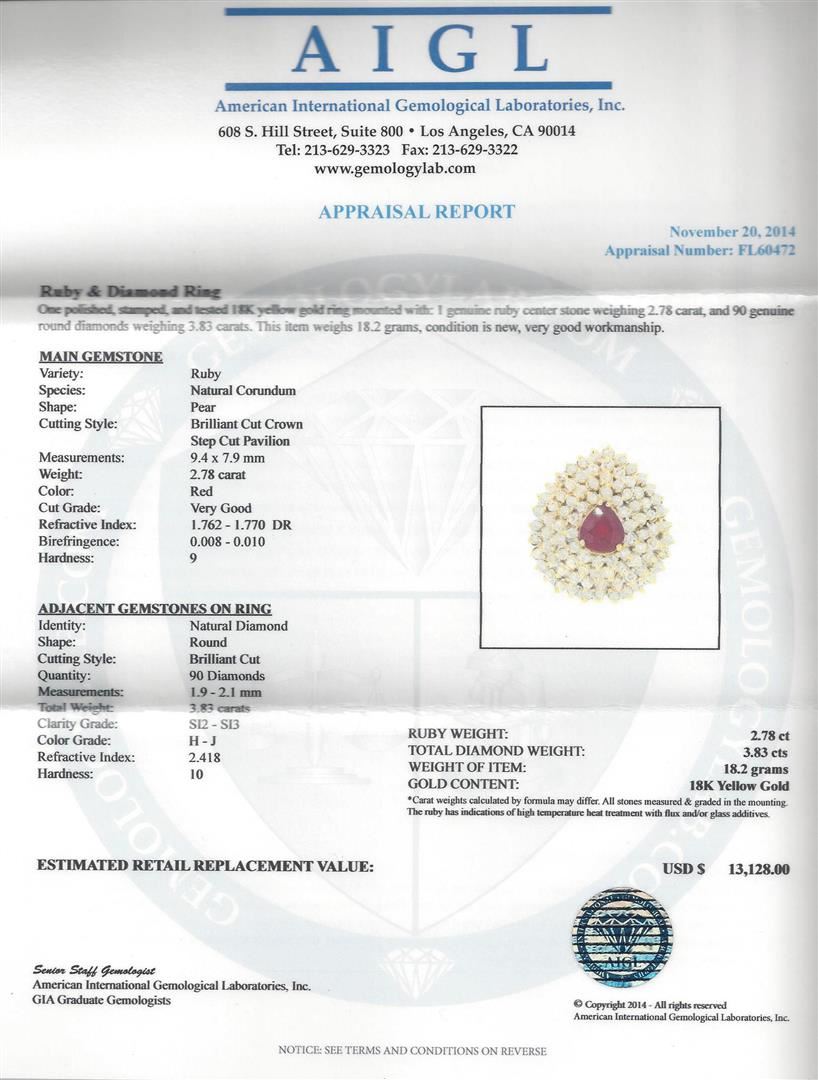 One polished, stamped, and tested 18K yellow gold ring mounted with: 1 genuine ruby center stone weighing 2.78 carat, and 90 genuine round diamonds weighing 3.83 carats. This item weighs 18.2 grams, condition is new, very good workmanship. MAIN GEMSTONE: Variety: Ruby. Species: Natural Corundum. Shape: Pear. Cutting Style: Brilliant Cut Crown Step Cut Pavilion. Measurements: 9.4 x 7.9 mm. Weight: 2.78 carat. Color: Red. Cut Grade: Very Good. Refractive Index: 1.762 - 1.770 DR. Birefringence: 0.008 - 0.010. Hardness: 9. ADJACENT GEMSTONES ON RING: Identity: Natural Diamond. Shape: Round. Cutting Style: Brilliant Cut. Quantity: 90 Diamonds. Measurements: 1.9 - 2.1 mm. Total Weight: 3.83 carats. Clarity Grade: SI2 - SI3. Color Grade: H - J. Refractive Index: 2.418. Hardness: 10. Ruby Weight: 2.78 ct. Total Diamond Weight: 3.83 cts. Weight of Item: 18.2 grams. Gold Content: 18K Yellow Gold. AIGL Appraised at $13,128.00.