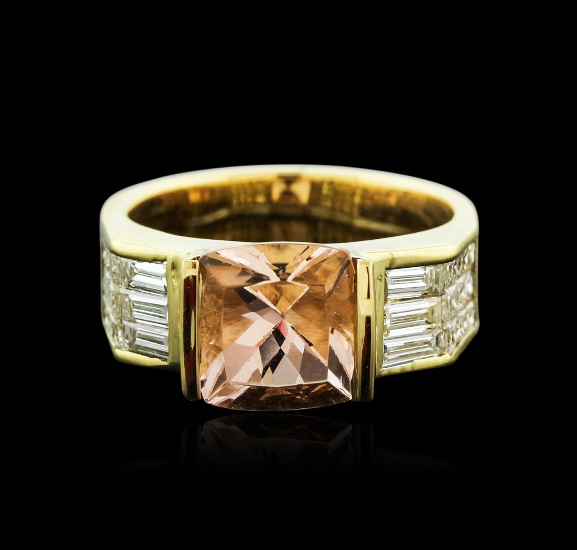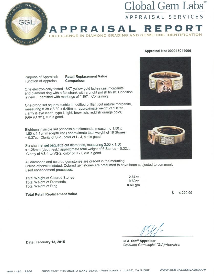 One electronically tested 18KT yellow gold ladies cast morganite and diamond ring with a flat shank with a bright polish finish. Identified with markings of "18K". Condition is new. Containing: One prong set square cushion modified brilliant cut natural morganite, measuring 8.38 x 8.30 x 6.46mm, approximate weight of 2.87ct., clarity is eye clean, type I, light, brownish, reddish orange color, (GIA rO 3/1), cut is good. Eighteen invisible set princess cut diamonds, measuring 1.50 x 1.50 x 1.13mm (depth est.) approximate total weight of 18 Stones = 0.37ct. Clarity: SI-1. Color: I - J, Cut is Good. Six channel set baguette cut diamonds, measuring 3.00 x 1.50 x 1.28mm (depth est.) approximate total weight of 6 Stones = 0.32ct. Clarity: VS-1 to VS-2. Color: H - I, Cut is Good. All diamonds and colored gemstones are graded in the mounting, unless otherwise stated. Colored gemstones are presumed to have been subjected to commonly used enhancement processes. Total Weight of Colored Stones 2.87ct. Total Weight of Diamonds 0.69ct. Total Weight of Ring 8.60 grams. GGL Appraised at $4,220.00.