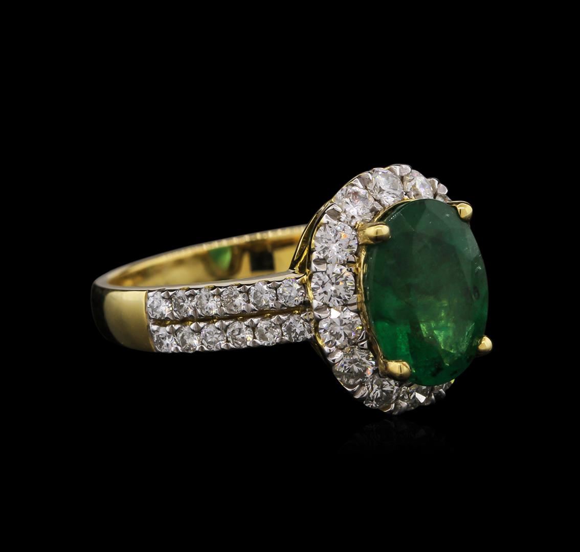 One electronically tested 18KT yellow gold ladies cast emerald and diamond ring with a bright polish finish. Identified with markings of "18K". Condition is new. Containing: One prong set oval modified brilliant cut natural emerald, measuring 10.70 x 8.60 x 5.59mm, approximate weight of 2.91ct., clarity is moderately included, type III, medium, moderately strong, green color, (GIA G 5/4), cut is good. Thirty-Eight prong set round brilliant cut diamonds, measuring 2.30 - 1.50 x 1.14mm (depth est.) approximate total weight of 38 Stones = 1.24ct. Clarity: SI-1 to SI-2. Color: H - I, Cut is Good. Diamonds are graded in the mounting, unless otherwise stated. Total Weight of Colored Stones 2.91ct. Total Weight of Diamonds 1.24ct. Total Weight of Ring 6.60 grams. GGL Appraised at $5,370.00.