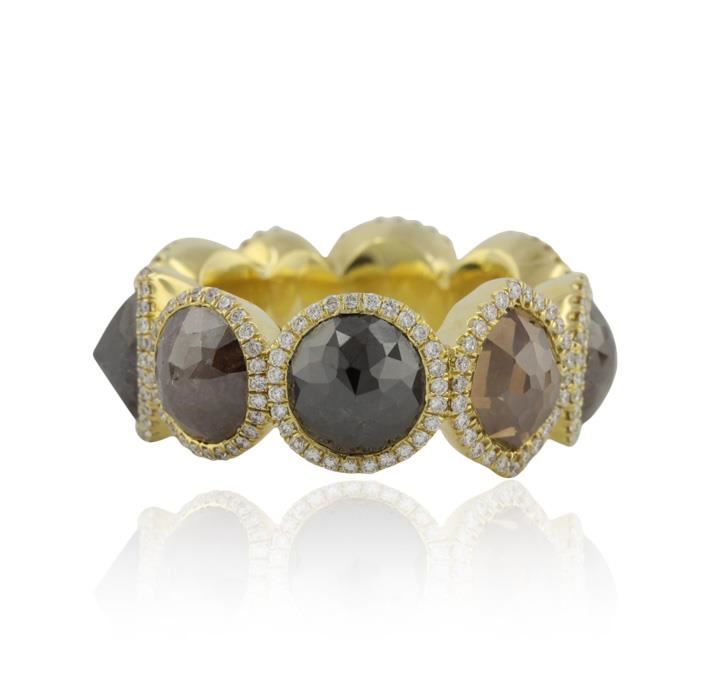 One electronically tested 18KT yellow gold ladies cast diamond ring with a bright polish finish. The ring features a continuous multi-shape diamond ribbon each set within a diamond bezel. The average width of the ring is ten millimeters. Condition is good. Containing: One bezel set rose cut diamond, measuring 8.80 - 7.50 x 6.11mm (depth est.) approximate weight of 2.45ct. Indications of multiple laboratory enhancements. Graded in the setting. Clarity Déclassé. Color Fancy Black; Irradiated. One bezel set rose cut diamond, measuring 6.50 - 6.00 x 4.69mm (depth est.) approximate weight of 1.25ct. Graded in the setting. Clarity I-3. Color Fancy Light Greenish Yellow. One bezel set rose cut diamond, measuring 5.80 - 4.80 x 3.98mm (depth est.) approximate weight of 1.48ct. Graded in the setting. Clarity I-2. Color Fancy Light Brown. One bezel set cut diamond, measuring 8.20 - 7.20 x 5.78mm (depth est.) approximate weight of 2.02ct. Graded in the setting. Clarity I-3. Color Fancy Brown. One bezel set rose cut diamond, measuring 8.80 x 8.00 x 6.30mm (depth est.) approximate weight of 2.29ct. Graded in the setting. Clarity I-3. Color Fancy Light Brown. One bezel set rose cut diamond, measuring 8.50 - 8.00 x 6.19mm (depth est.) approximate weight of 2.03ct. Graded in the setting. Clarity I-3. Color Fancy Brown. One bezel set rose cut diamond, measuring 8.50 - 7.50 x 6.00mm (depth est.) approximate weight of 1.95ct. Faint brown secondary color throughout. Graded in the setting. Clarity I-2. Color M. One bezel set rose cut diamond, measuring 8.50 - 8.20 x 6.27mm (depth est.) approximate weight of 2.45ct. Indications of multiple laboratory enhancements. Graded in the setting. Clarity Déclassé. Color Fancy Black; Irradiated. One bezel set rose cut diamond, measuring 8.20 - 7.70 x 5.96mm (depth est.) approximate weight of 2.08ct. Naturally occurring internal & external characteristics are present, including brown iron staining. Graded in the setting. Clarity I-1. Color K. Two Hundred seventy bead set round brilliant cut diamonds, measuring 1.20 - 1.20 x 0.76mm (depth est.), 3.00% GTCF approximate total weight of 270 Stones = 2.00ct. Graded in the setting. Clarity VS-1 to VS-2. Color E-G. Total Weight of Diamonds 20.00 ct. Total Weight of Ring 19.94gm. AIG Appraised at $61,540.00.