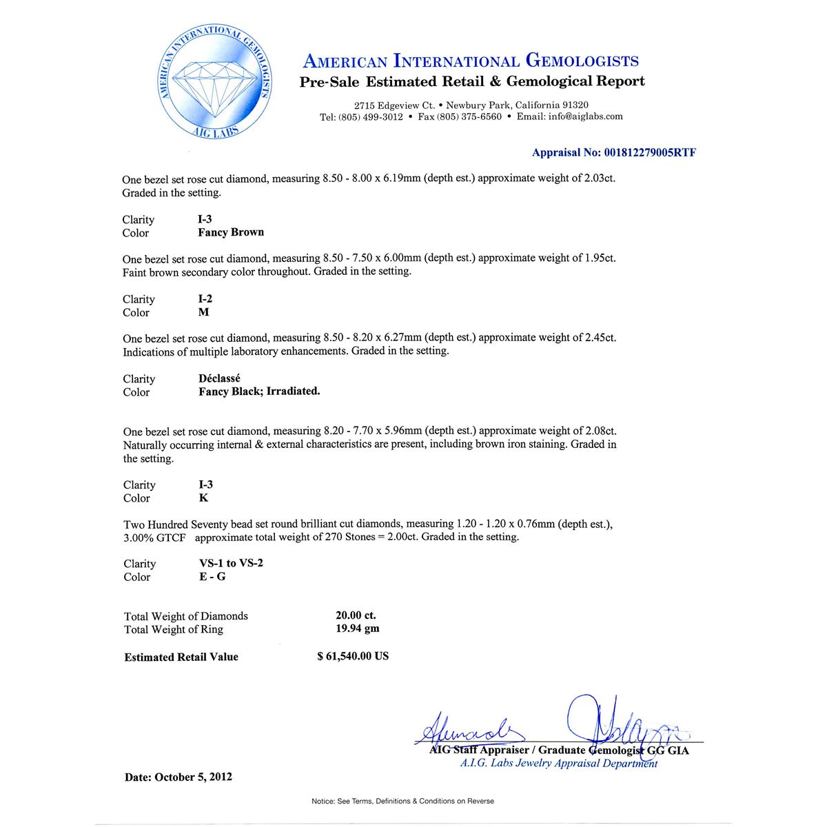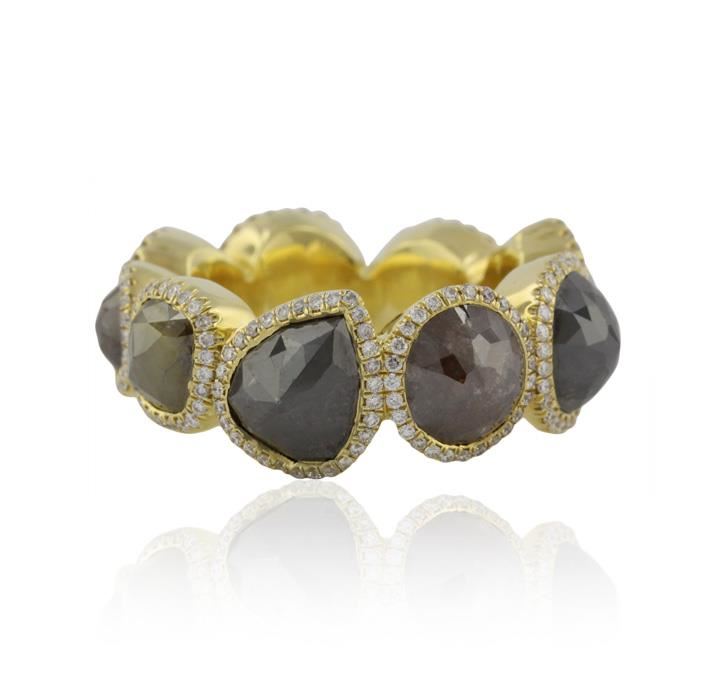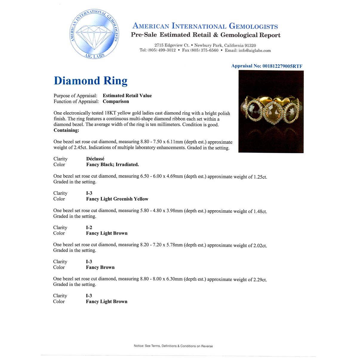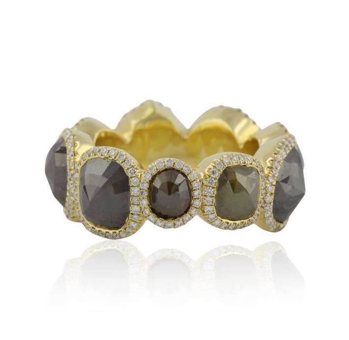 One electronically tested 18KT yellow gold ladies cast diamond ring with a bright polish finish. The ring features a continuous multi-shape diamond ribbon each set within a diamond bezel. The average width of the ring is ten millimeters. Condition is good. Containing: One bezel set rose cut diamond, measuring 8.80 -- 7.50 x 6.11mm (depth est.) approximate weight of 2.45ct. Indications of multiple laboratory enhancements. Graded in the setting. Clarity Declasse. Color Fancy Black; Irradiated. One bezel set rose cut diamond, measuring 6.50 -- 6.00 x 4.69mm (depth est.) approximate weight of 1.25ct. Graded in the setting. Clarity I-3. Color Fancy Light Greenish Yellow. One bezel set rose cut diamond, measuring 5.80 -- 4.80 x 3.98mm (depth est.) approximate weight of 1.48ct. Graded in the setting. Clarity I-2. Color Fancy Light Brown. One bezel set cut diamond, measuring 8.20 -- 7.20 x 5.78mm (depth est.) approximate weight of 2.02ct. Graded in the setting. Clarity I-3. Color Fancy Brown. One bezel set rose cut diamond, measuring 8.80 x 8.00 x 6.30mm (depth est.) approximate weight of 2.29ct. Graded in the setting. Clarity I-3. Color Fancy Light Brown. One bezel set rose cut diamond, measuring 8.50 -- 8.00 x 6.19mm (depth est.) approximate weight of 2.03ct. Graded in the setting. Clarity I-3. Color Fancy Brown. One bezel set rose cut diamond, measuring 8.50 -- 7.50 x 6.00mm (depth est.) approximate weight of 1.95ct. Faint brown secondary color throughout. Graded in the setting. Clarity I-2. Color M. One bezel set rose cut diamond, measuring 8.50 -- 8.20 x 6.27mm (depth est.) approximate weight of 2.45ct. Indications of multiple laboratory enhancements. Graded in the setting. Clarity Declasse. Color Fancy Black; Irradiated. One bezel set rose cut diamond, measuring 8.20 -- 7.70 x 5.96mm (depth est.) approximate weight of 2.08ct. Naturally occurring internal & external characteristics are present, including brown iron staining. Graded in the setting. Clarity I-1. Color K. Two Hundred seventy bead set round brilliant cut diamonds, measuring 1.20 -- 1.20 x 0.76mm (depth est.), 3.00% GTCF approximate total weight of 270 Stones = 2.00ct. Graded in the setting. Clarity VS-1 to VS-2. Color E-G. Total Weight of Diamonds 20.00 ct. Total Weight of Ring 19.94gm. AIG Appraised at $61,540.00.