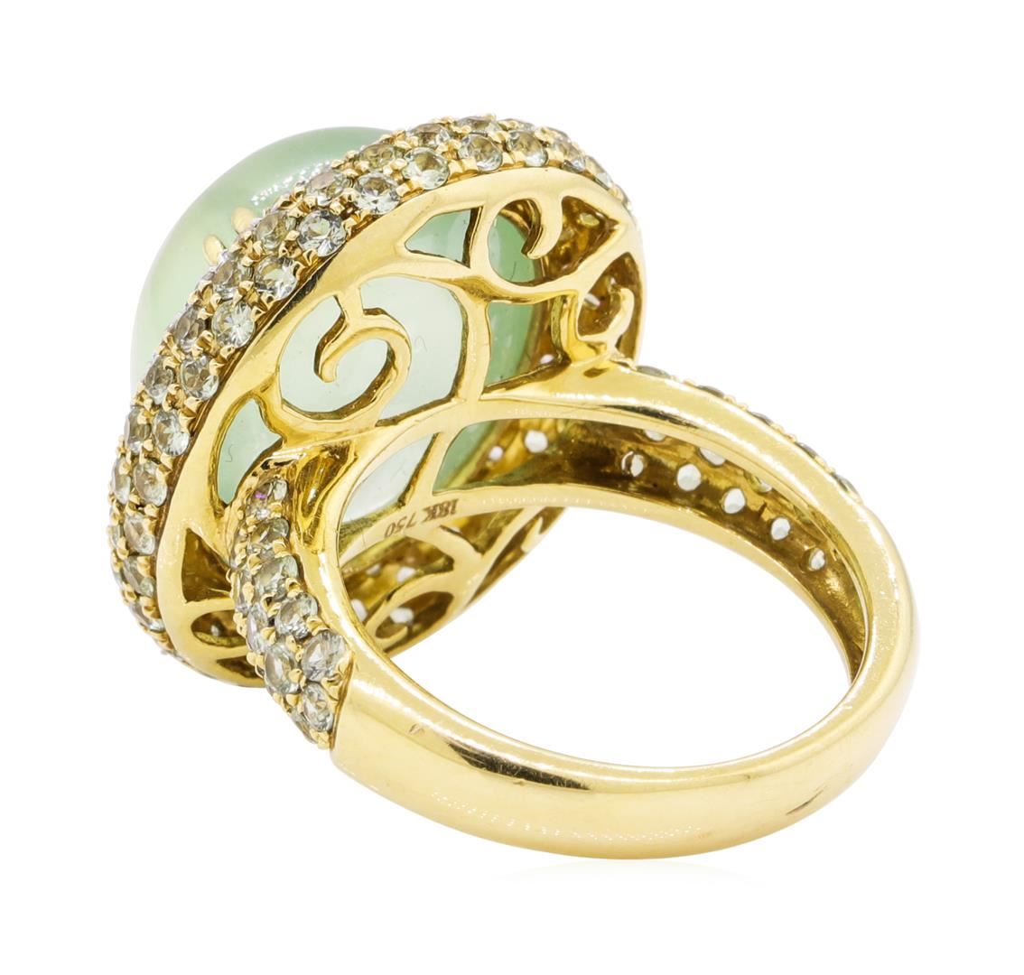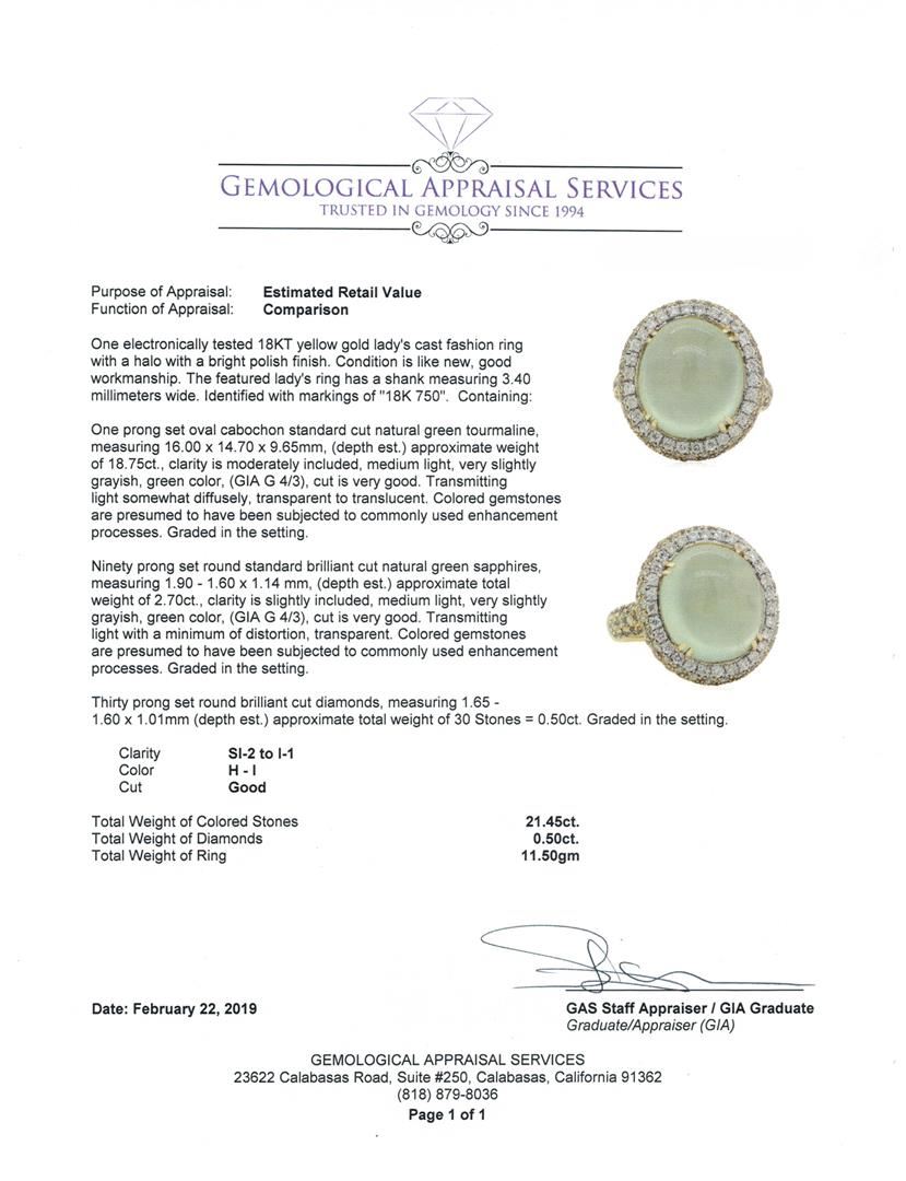 One electronically tested 18KT yellow gold lady's cast fashion ring with a halo with a bright polish finish. The featured lady's ring has a shank measuring 3.40 millimeters wide. Identified with markings of '18K 750'. Condition is like new, good workmanship. Containing: One prong set oval cabochon standard cut natural green tourmaline, measuring 16.00 x 14.70 x 9.65mm, (depth est.) approximate weight of 18.75ct.,, Clarity is moderately included, medium light, very slightly grayish, green color, (GIA G 4/3), cut is very good. Transmitting light somewhat diffusely, transparent to translucent. Colored gemstones are presumed to have been subjected to commonly used enhancement processes. Graded in the setting. Ninety prong set round standard brilliant cut natural green sapphires, measuring 1.90 - 1.60 x 1.14 mm, (depth est.) approximate total weight of 2.70ct.,, Clarity is slightly included, medium light, very slightly grayish, green color, (GIA G 4/3), cut is very good. Transmitting light with a minimum of distortion, transparent. Colored gemstones are presumed to have been subjected to commonly used enhancement processes. Graded in the setting. Thirty prong set round brilliant cut diamonds, measuring 1.65 - 1.60 x 1.01mm (depth est.) approximate total weight of 30 Stones = 0.50ct. Graded in the setting. Color H - I, Clarity SI-2 to I-1, Cut Good. Total Weight of Colored Stones 21.45ct. Total Weight of Diamonds 0.50ct. Total Weight of Ring 11.50gm. GAS Appraised.