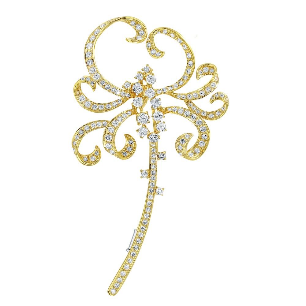 One 18KT Yellow Gold 3.18ctw Diamond Brooch. (155) Diamonds with a total weight of 3.18cts with a color of I and a clarity of I-1 to I-2. Total weight of this brooch is 11.42 grams.