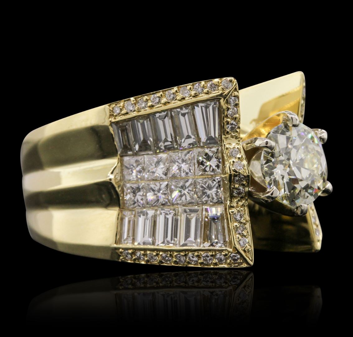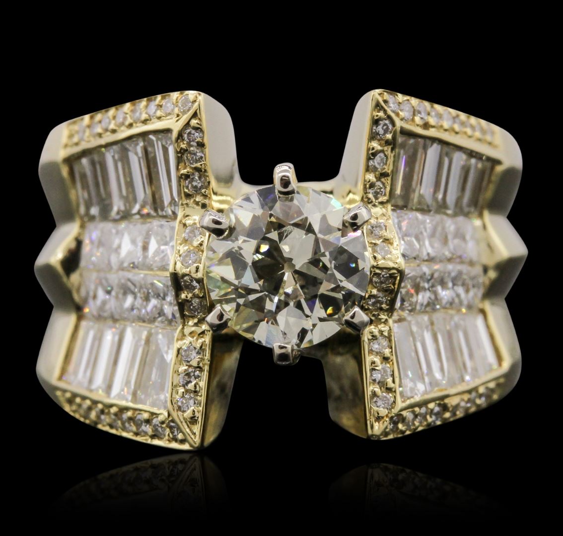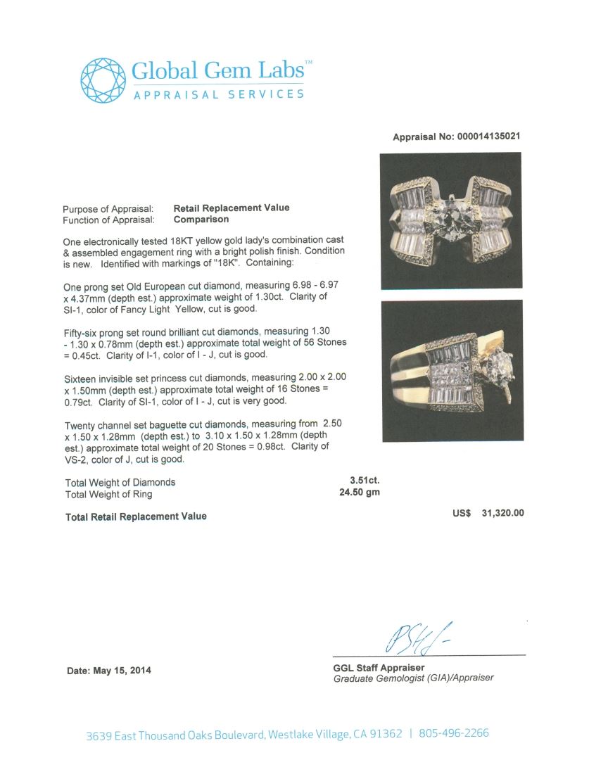 One electronically tested 18KT yellow gold Ladies combination cast & assembled engagement ring with a bright polish finish. Identified with markings of "18K". Condition is new. Containing: One prong set Old European cut diamond, measuring 6.98 - 6.97 x 4.37mm (depth est.) approximate weight of 1.30ct. Clarity: SI-1, Cut is Good. Fifty-Six prong set round brilliant cut diamonds, measuring 1.30 - 1.30 x 0.78mm (depth est.) approximate. Total Weight of 56 Stones = 0.45ct. Clarity: I-1. Color: I - J, Cut is Good. Sixteen invisible set princess cut diamonds, measuring 2.00 x 2.00 x 1.50mm (depth est.) approximate. Total Weight of 16 Stones = 0.79ct. Clarity: SI-1. Color: I - J, Cut is Very Good. Twenty channel set baguette cut diamonds, measuring from 2.50 x 1.50 x 1.28mm (depth est.) to 3.10 x 1.50 x 1.28mm (depth est.) approximate. Total Weight of 20 Stones = 0.98ct. Clarity: VS-2. Color: J, Cut is Good. Total Weight of Diamonds 3.51ct. Total Weight of Ring 24.50 grams. GGL Appraised at $31,320.00.