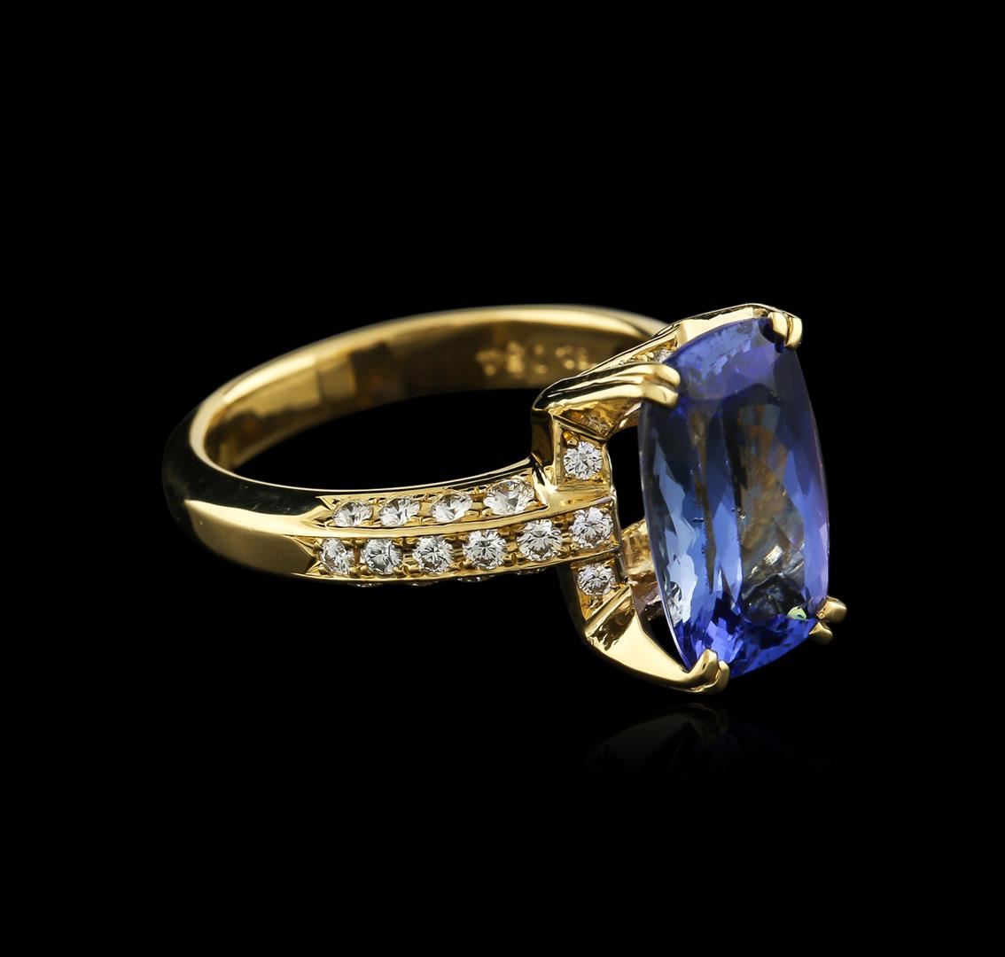 One electronically tested 18KT yellow gold ladies cast tanzanite and diamond ring with a bright polish finish. Identified with markings of "750". Condition is new. Containing: One prong set rectangular cushion modified brilliant cut natural tanzanite, measuring 12.50 x 7.80 x 5.07mm, approximate weight of 3.89ct., clarity is eye clean, type I, medium light, very slightly grayish, violet color, (GIA V 4/3), cut is good. Forty-Four prong set round brilliant cut diamonds, measuring 1.50 - 1.50 x 0.90mm (depth est.) approximate total weight of 44 Stones = 0.54ct. Clarity: SI-1 to SI-2. Color: I - J, Cut is Good. Diamonds and colored gemstones are graded in the mounting, unless otherwise stated. Colored gemstones are presumed to have been subjected to commonly used enhancement processes.. Total Weight of Colored Stones 3.89ct. Total Weight of Diamonds 0.54ct. Total Weight of Ring 6.30 grams. GGL Appraised at $4,470.00.