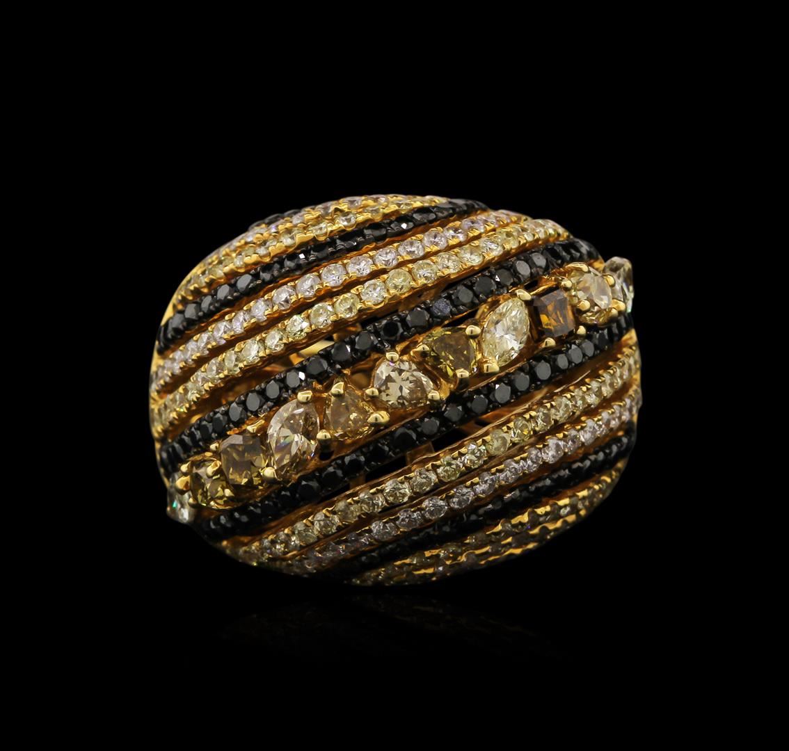 One electronically tested 18KT yellow gold ladies cast diamond ring with a bright polish finish. Identified with markings of "18K". Condition is new. Containing: Eleven prong set marquise shaped cut diamonds, measuring 4.00. x 2.00. x 1.26mm (depth est.) approximate total weight of 11 Stones = 1.46ct. Clarity: SI-1 to SI-2, Color of fancy yellow, fancy greenish yellow and fancy brown. Cut is Good. One Hundred prong set round brilliant cut diamonds, measuring 1.10 - 1.10 x 0.66mm (depth est.) approximate total weight of 100 Stones = 1.09ct. Color of Fancy Black. Cut is Good. Seventy-Six prong set round brilliant cut diamonds, measuring 1.30 - 1.30 x 0.78mm (depth est.) approximate total weight of 76 Stones = 0.78ct. Clarity: SI-1 to SI-2, Color of Light Yellow. Cut is Good. Sixty-Four prong set round brilliant cut diamonds, measuring 1.40 - 1.40 x 0.84mm (depth est.) approximate total weight of 64 Stones = 0.70ct. Clarity: SI-1 to I-1. Color: I - J, Cut is Good. Diamonds are graded in the mounting, unless otherwise stated. Total Weight of Diamonds 4.03ct. Total Weight of Ring 14.60 grams. GGL Appraised at $10,950.00.