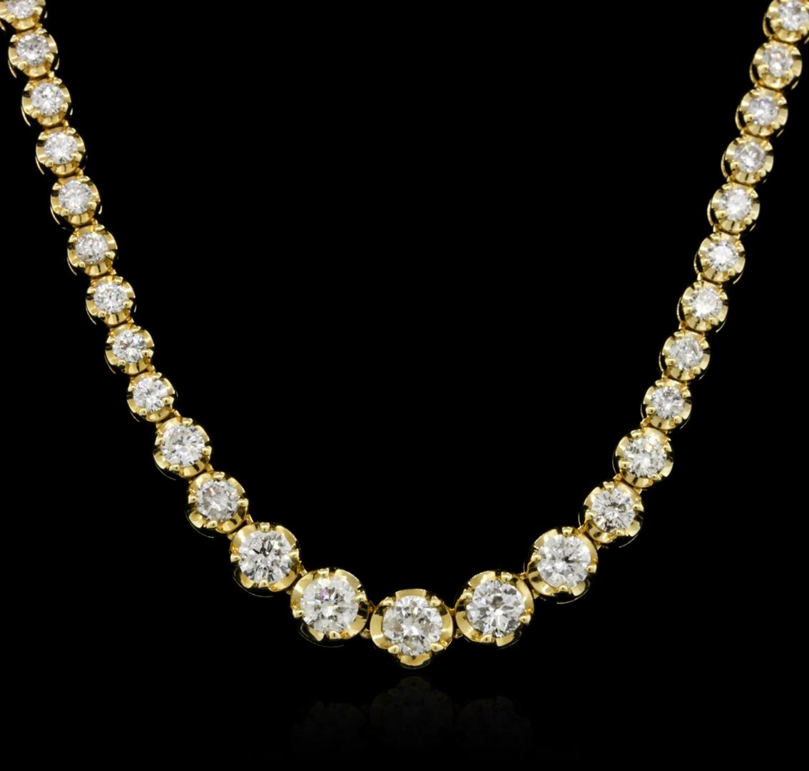 One electronically tested 18KT yellow gold ladies combination cast & assembled diamond necklace with a hidden box clasp with safety closer with a bright polish finish. Measurements: 16.50" in length Identified with markings of "K18". Condition is new. Containing: Eight prong set round brilliant cut diamonds, measuring 3.50 - 3.00 x 1.95mm (depth est.) approximate total weight of 8 Stones = 1.01ct. Clarity: SI-1 to I-2. Color: I - J. One Hundred Twenty prong set round brilliant cut diamonds, measuring 2.00 - 2.00 x 1.20mm (depth est.) approximate total weight of 120 Stones = 3.50ct. Clarity: SI-1 to I-1. Color: I - J, Cut is Good. All diamonds are graded in the mounting, unless otherwise stated. Total Weight of Diamonds 4.51ct. Total Weight of Necklace 16.90 grams. GGL Appraised at $10,595.00.
