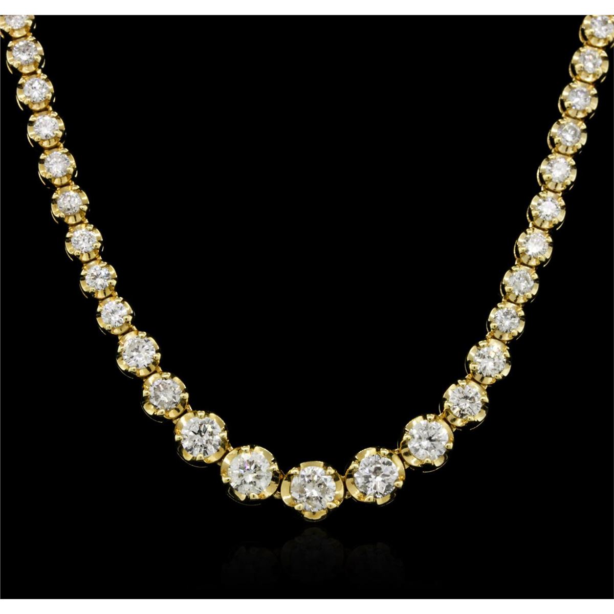 One electronically tested 18KT yellow gold ladies combination cast & assembled diamond necklace with a hidden box clasp with safety closer with a bright polish finish. Measurements: 16.50" in length Identified with markings of "K18". Condition is new. Containing: Eight prong set round brilliant cut diamonds, measuring 3.50 - 3.00 x 1.95mm (depth est.) approximate total weight of 8 Stones = 1.01ct. Clarity: SI-1 to I-2. Color: I - J. One Hundred Twenty prong set round brilliant cut diamonds, measuring 2.00 - 2.00 x 1.20mm (depth est.) approximate total weight of 120 Stones = 3.50ct. Clarity: SI-1 to I-1. Color: I - J, Cut is Good. All diamonds are graded in the mounting, unless otherwise stated. Total Weight of Diamonds 4.51ct. Total Weight of Necklace 16.90 grams. GGL Appraised at $10,595.00.
