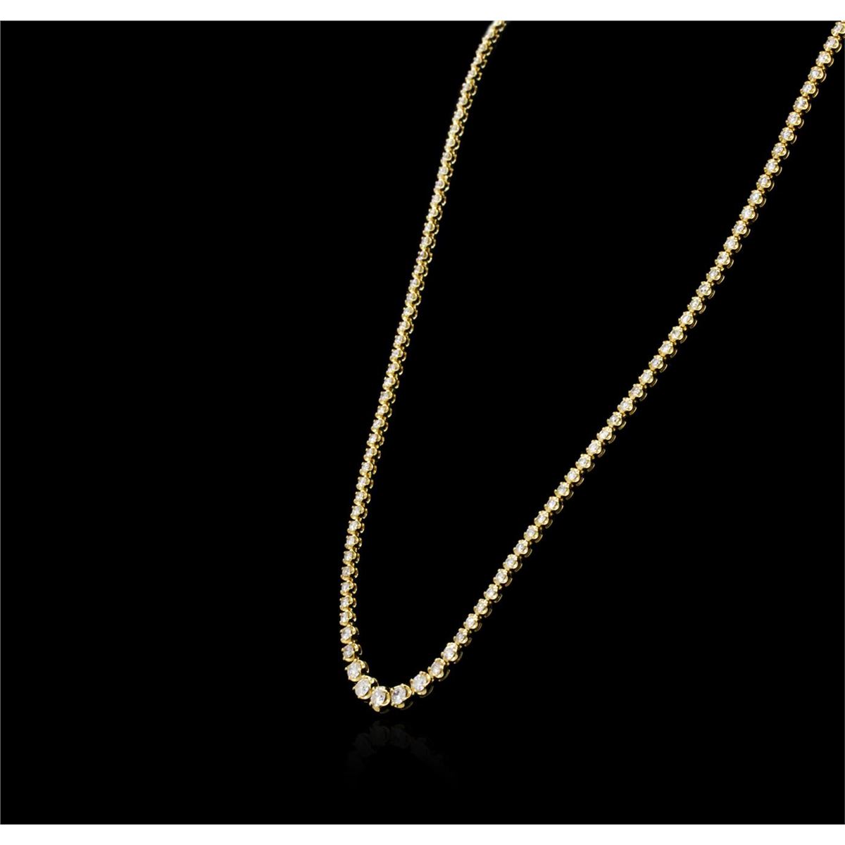 One electronically tested 18KT yellow gold ladies combination cast & assembled diamond necklace with a hidden box clasp with safety closer with a bright polish finish. Measurements: 16.50" in length Identified with markings of "K18". Condition is new. Containing: Eight prong set round brilliant cut diamonds, measuring 3.50 - 3.00 x 1.95mm (depth est.) approximate total weight of 8 Stones = 1.01ct. Clarity: SI-1 to I-2. Color: I - J. One Hundred Twenty prong set round brilliant cut diamonds, measuring 2.00 - 2.00 x 1.20mm (depth est.) approximate total weight of 120 Stones = 3.50ct. Clarity: SI-1 to I-1. Color: I - J, Cut is Good. All diamonds are graded in the mounting, unless otherwise stated. Total Weight of Diamonds 4.51ct. Total Weight of Necklace 16.90 grams. GGL Appraised at $10,595.00.