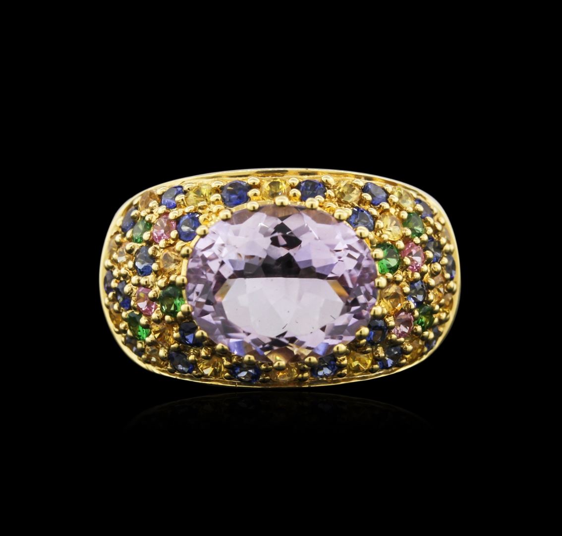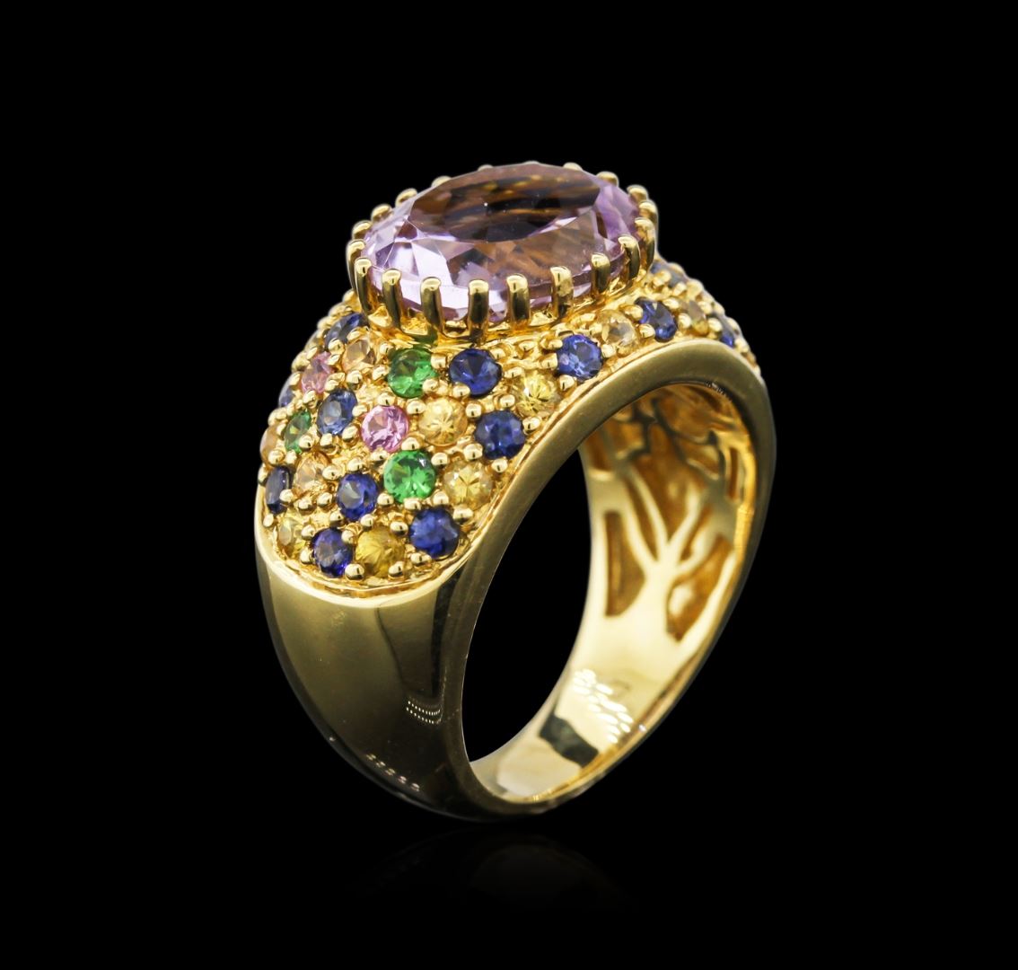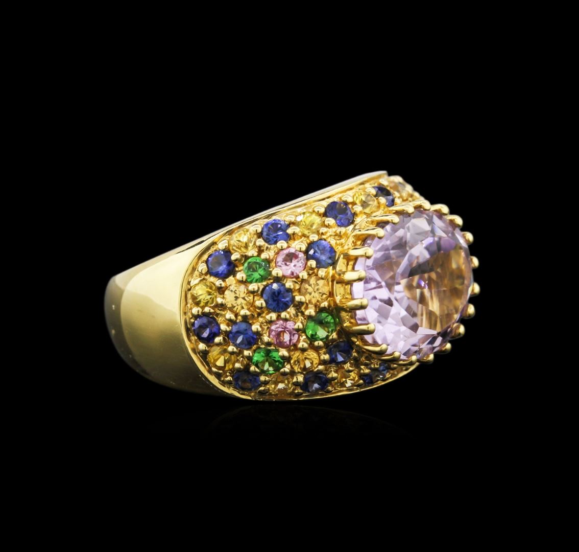 One ring featuring: 18KT yellow gold weighing 8.38 grams containing one pink amethyst center stone with a total weight of 4.53ct, 22 blue sapphires with a total weight of 0.84ct, four pink sapphires with a total weight of 0.17ct, five yellow sapphires with a total weight of 0.24ct, 15 orange sapphires with a total weight of 0.58ct and six tsavorites with a total weight of 0.22ct.