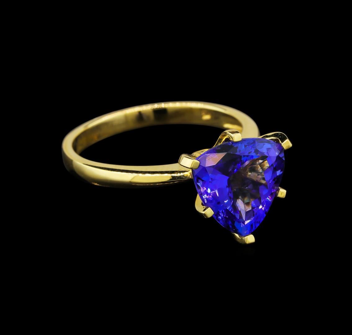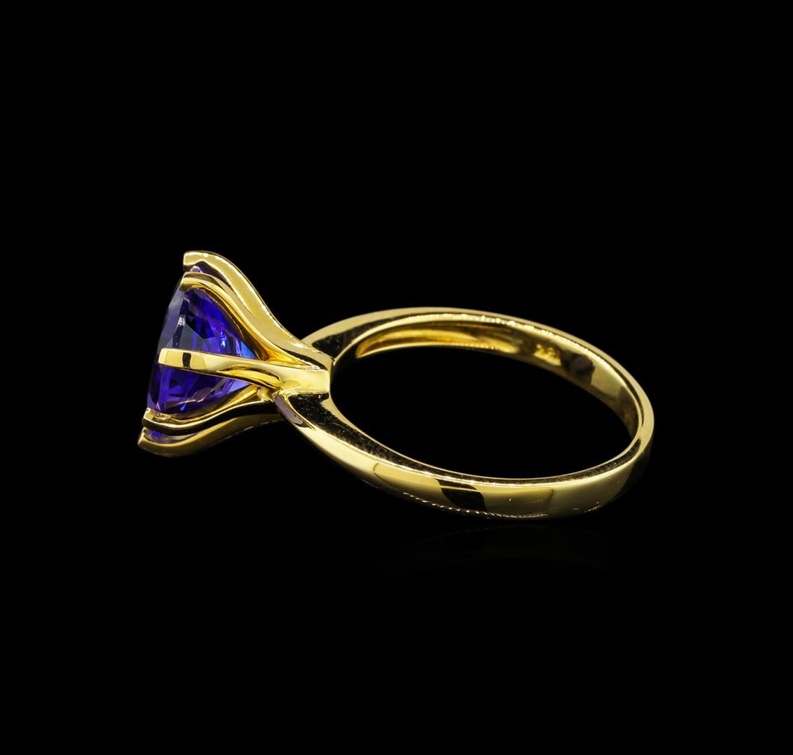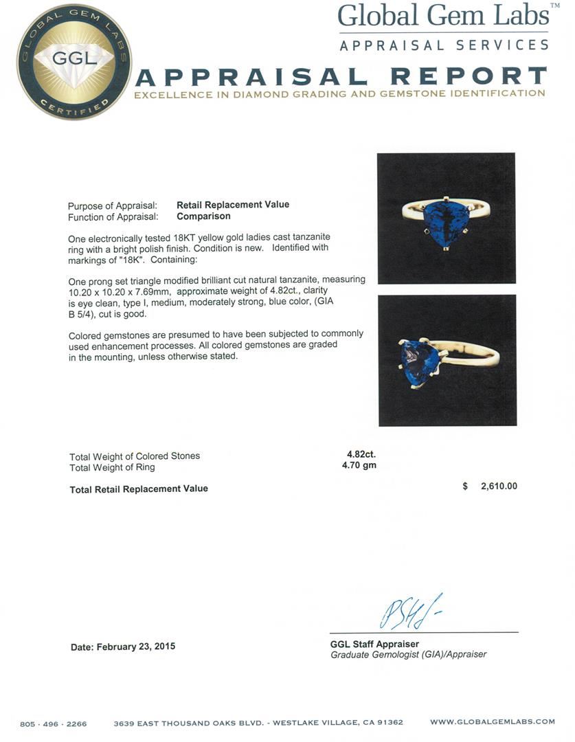 One electronically tested 18KT yellow gold ladies cast tanzanite ring with a bright polish finish. Identified with markings of "18K". Condition is new. Containing: One prong set triangle modified brilliant cut natural tanzanite, measuring 10.20 x 10.20 x 7.69mm, approximate weight of 4.82ct., clarity is eye clean, type I, medium, moderately strong, blue color, (GIA B 5/4), cut is good. Colored gemstones are presumed to have been subjected to commonly used enhancement processes. All colored gemstones are graded in the mounting, unless otherwise stated. Total Weight of Colored Stones 4.82ct. Total Weight of Ring 4.70 grams. GGL Appraised at $2,610.00.