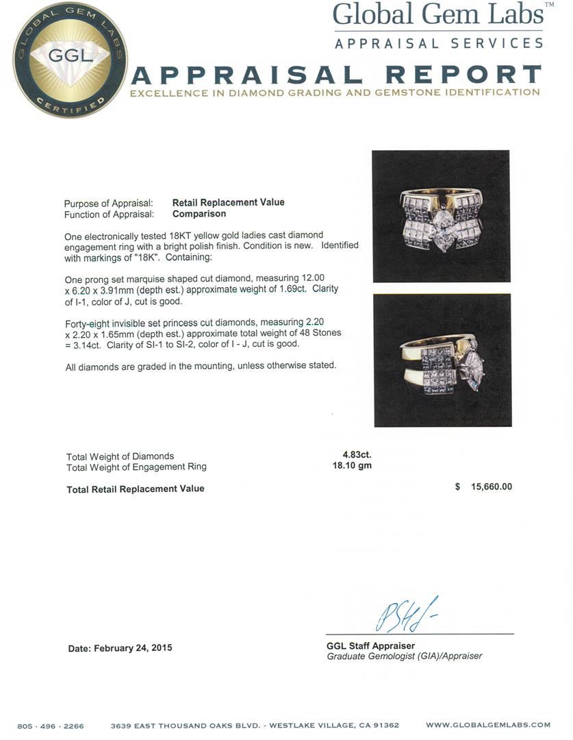 One electronically tested 18KT yellow gold ladies cast diamond engagement ring with a bright polish finish. Identified with markings of "18K". Condition is new. Containing: One prong set marquise shaped cut diamond, measuring 12.00 x 6.20 x 3.91mm (depth est.) approximate weight of 1.69ct. Clarity: I-1. Color: J, Cut is Good. Forty-Eight invisible set princess cut diamonds, measuring 2.20 x 2.20 x 1.65mm (depth est.) approximate total weight of 48 Stones = 3.14ct. Clarity: SI-1 to SI-2. Color: I - J, Cut is Good. All diamonds are graded in the mounting, unless otherwise stated. Total Weight of Diamonds 4.83ct. Total Weight of Engagement Ring 18.10 grams. GGL Appraised at $15,660.00.