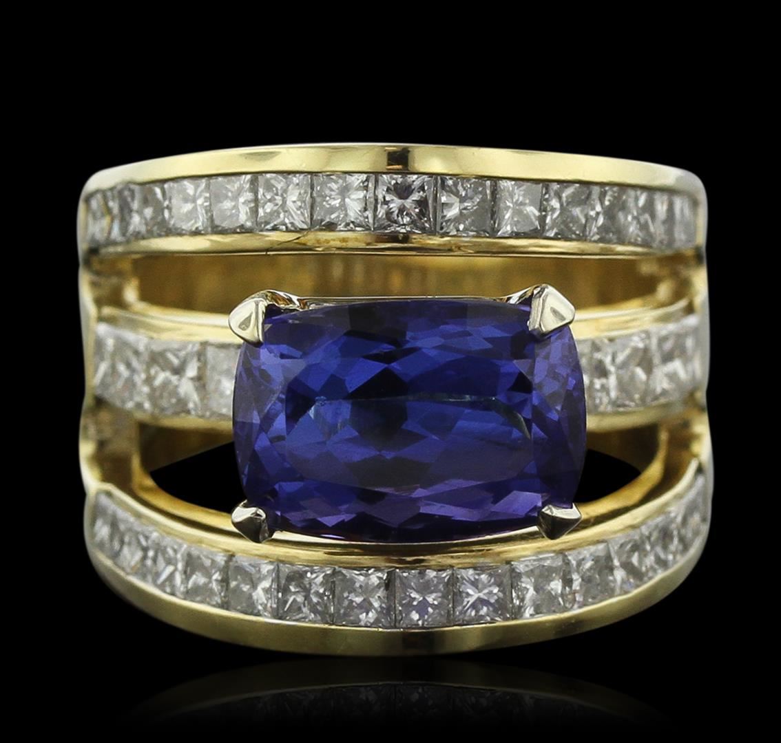 One electronically tested 18KT yellow gold ladies cast tanzanite and diamond ring with a bright polish finish. Condition is new, good workmanship. The featured tanzanite is supported by diamond set shoulders framed by mirroring diamond set orbits, terminating in a squared eight millimeter wide band. Trademark is SA. Identified with markings of "18K". Containing: One prong set rectangular cushion mixed cut natural tanzanite, measuring 12.20 x 8.45 x 6.00mm, 6% bulge factor, approximate weight of 5.16ct, clarity is eye clean, type I, medium dark, moderately strong, violetish blue color, (GIA vB 6/4), cut is good. Transmitting light with no distortion, transparent. Colored Stone Grading Report attached. Graded in the setting. Tanzanite is a very rare gemstone that is only found in the country of Tanzania. Originally discovered in 1967. Tiffany & Company, named the stone Tanzanite. It is found in the Usumburu Mountains that border the Umba Valley of northern Tanzania. Tanzanite occurs in gray, brown, violet, blue, reddish-purple, & green. The gem is interesting because of its exceptional pleochroism. Rotated in different directions a tanzanite will exhibit multiple changes of color. Tanzanite has a low tolerance to ultrasonic cleaning, and should not be cleaned using this method. Ten channel set princess cut diamonds, measuring 2.70 x 2.70 x 2.03mm (depth est.) approximate total weight of 10 Stones = 1.26ct. Measurements are an average for the group. Graded in the setting. Clarity VS-2 to SI-2 Color F-H. Thirty-four channel set princess cut diamonds, measuring 2.10 x 2.10 x 1.58mm (depth est.) approximate total weight of 34 Stones = 2.04ct. Measurements are an average for the group. Graded in the setting. Clarity VS-2 to SI-2. Color F-H. Total Weight of Colored Stones 5.16ct. Total Weight of Diamonds 3.30ct. Total Weight of Ring 23.70 grams. AIG Appraised at $30,850.00.