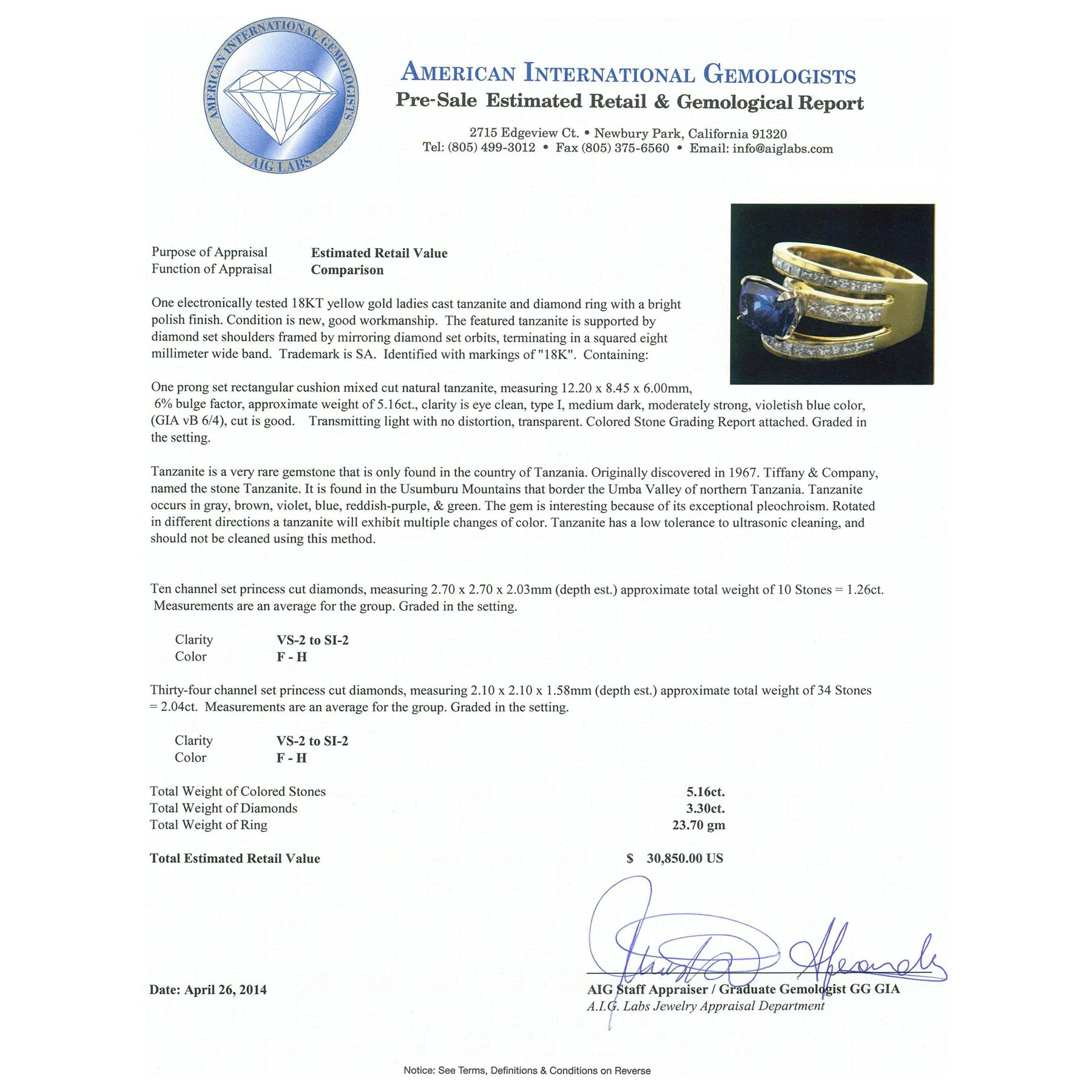 One electronically tested 18KT yellow gold ladies cast tanzanite and diamond ring with a bright polish finish. Condition is new, good workmanship. The featured tanzanite is supported by diamond set shoulders framed by mirroring diamond set orbits, terminating in a squared eight millimeter wide band. Trademark is SA. Identified with markings of "18K". Containing: One prong set rectangular cushion mixed cut natural tanzanite, measuring 12.20 x 8.45 x 6.00mm, 6% bulge factor, approximate weight of 5.16ct, clarity is eye clean, type I, medium dark, moderately strong, violetish blue color, (GIA vB 6/4), cut is good. Transmitting light with no distortion, transparent. Colored Stone Grading Report attached. Graded in the setting. Tanzanite is a very rare gemstone that is only found in the country of Tanzania. Originally discovered in 1967. Tiffany & Company, named the stone Tanzanite. It is found in the Usumburu Mountains that border the Umba Valley of northern Tanzania. Tanzanite occurs in gray, brown, violet, blue, reddish-purple, & green. The gem is interesting because of its exceptional pleochroism. Rotated in different directions a tanzanite will exhibit multiple changes of color. Tanzanite has a low tolerance to ultrasonic cleaning, and should not be cleaned using this method. Ten channel set princess cut diamonds, measuring 2.70 x 2.70 x 2.03mm (depth est.) approximate total weight of 10 Stones = 1.26ct. Measurements are an average for the group. Graded in the setting. Clarity VS-2 to SI-2 Color F-H. Thirty-four channel set princess cut diamonds, measuring 2.10 x 2.10 x 1.58mm (depth est.) approximate total weight of 34 Stones = 2.04ct. Measurements are an average for the group. Graded in the setting. Clarity VS-2 to SI-2. Color F-H. Total Weight of Colored Stones 5.16ct. Total Weight of Diamonds 3.30ct. Total Weight of Ring 23.70 grams. AIG Appraised at $30,850.00.