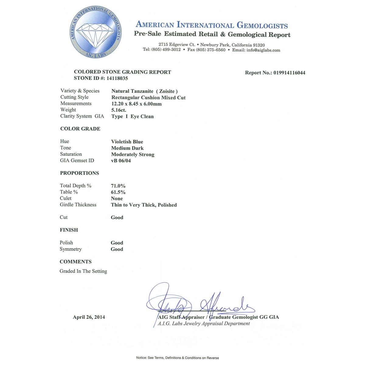 One electronically tested 18KT yellow gold ladies cast tanzanite and diamond ring with a bright polish finish. Condition is new, good workmanship. The featured tanzanite is supported by diamond set shoulders framed by mirroring diamond set orbits, terminating in a squared eight millimeter wide band. Trademark is SA. Identified with markings of "18K". Containing: One prong set rectangular cushion mixed cut natural tanzanite, measuring 12.20 x 8.45 x 6.00mm, 6% bulge factor, approximate weight of 5.16ct, clarity is eye clean, type I, medium dark, moderately strong, violetish blue color, (GIA vB 6/4), cut is good. Transmitting light with no distortion, transparent. Colored Stone Grading Report attached. Graded in the setting. Tanzanite is a very rare gemstone that is only found in the country of Tanzania. Originally discovered in 1967. Tiffany & Company, named the stone Tanzanite. It is found in the Usumburu Mountains that border the Umba Valley of northern Tanzania. Tanzanite occurs in gray, brown, violet, blue, reddish-purple, & green. The gem is interesting because of its exceptional pleochroism. Rotated in different directions a tanzanite will exhibit multiple changes of color. Tanzanite has a low tolerance to ultrasonic cleaning, and should not be cleaned using this method. Ten channel set princess cut diamonds, measuring 2.70 x 2.70 x 2.03mm (depth est.) approximate total weight of 10 Stones = 1.26ct. Measurements are an average for the group. Graded in the setting. Clarity VS-2 to SI-2 Color F-H. Thirty-four channel set princess cut diamonds, measuring 2.10 x 2.10 x 1.58mm (depth est.) approximate total weight of 34 Stones = 2.04ct. Measurements are an average for the group. Graded in the setting. Clarity VS-2 to SI-2. Color F-H. Total Weight of Colored Stones 5.16ct. Total Weight of Diamonds 3.30ct. Total Weight of Ring 23.70 grams. AIG Appraised at $30,850.00.