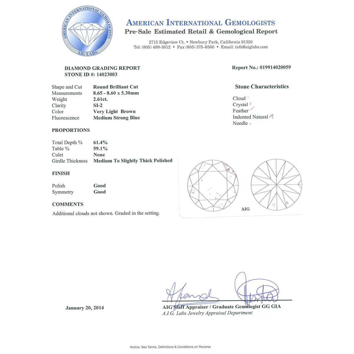 One electronically tested 18KT yellow gold ladies cast & assembled diamond ring with a bright polish finish. Condition is new, good workmanship. The featured diamond is cathedral set supported by elaborate diamond set shoulders, completed by a eight millimeter wide band. Identified with markings of "18K". Containing: One prong set round brilliant cut diamond, measuring 8.65 - 8.60 x 5.30mm (depth est.), 8.00%. GTCF approximate weight of 2.61ct with a medium strong blue fluorescence. Diamond Grading Report attached. Graded in the setting. Clarity: SI-2. Depth: 61.4%. Table 59.1%. Twelve invisible set baguette cut diamonds, measuring 3.50 x 2.10 x 1.47mm (depth est.) approximate. Total Weight of 12 Stones = 1.10ct. Graded in the setting. Clarity: VVS-2 to VS-2. Color: G - I. Fifty-Six invisible set princess cut diamonds, measuring 1.80 x 1.70 x 1.20mm (depth est.) approximate. Total Weight of 56 Stones = 1.73ct. Graded in the setting. Clarity: VS-2 to SI-2. Color: G - I. Thirty-Two bead set round brilliant cut diamonds, measuring 1.10 - 1.00 x 0.63mm (depth est.) approximate. Total Weight of 32 Stones = 0.17ct. Graded in the setting. Clarity: VS-1 to SI-1. Color: G - I. Total Weight of Diamonds 5.61ct. Total Weight of Ring 18.12gm. AIG Appraised at $60,960.00.