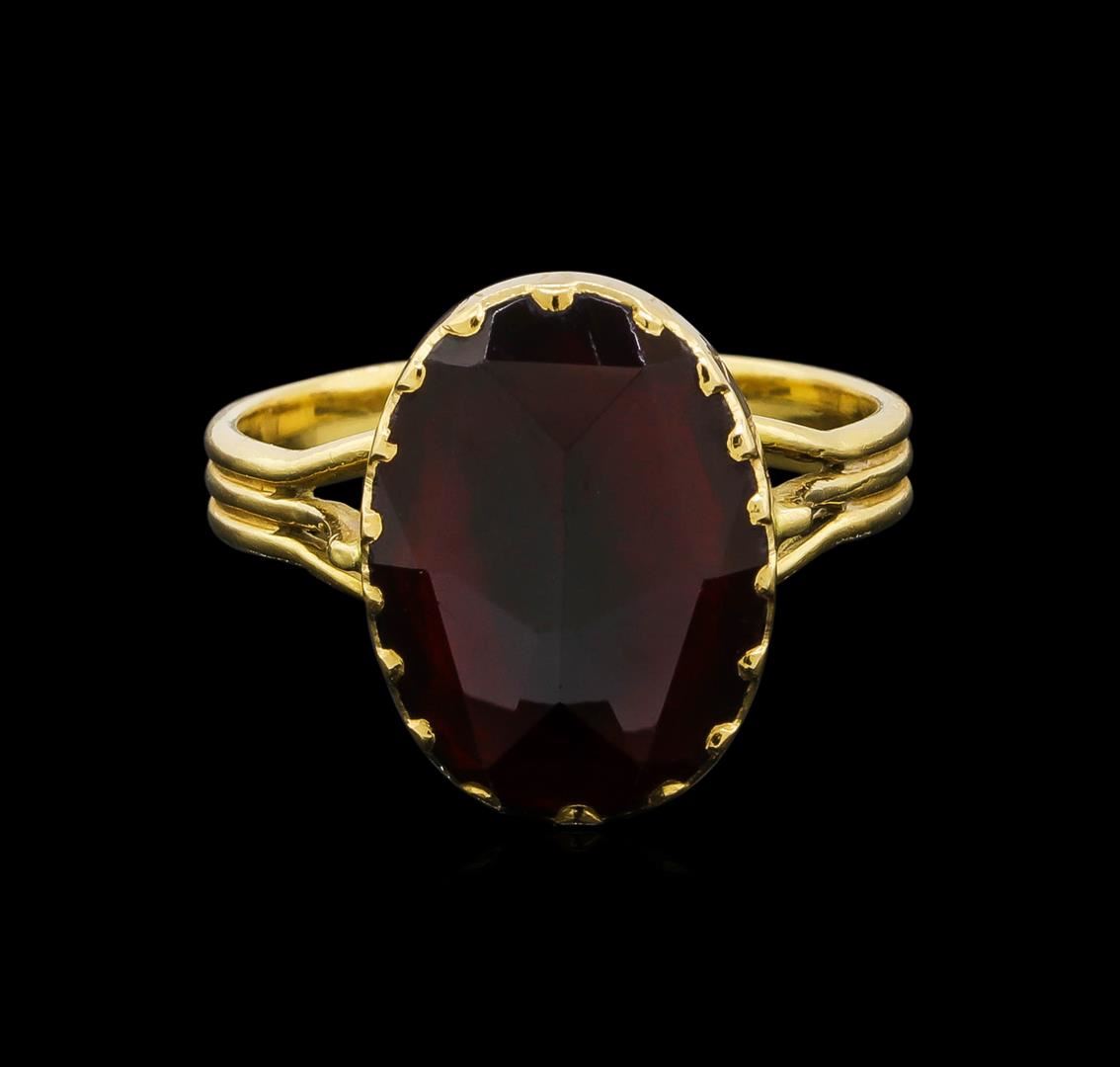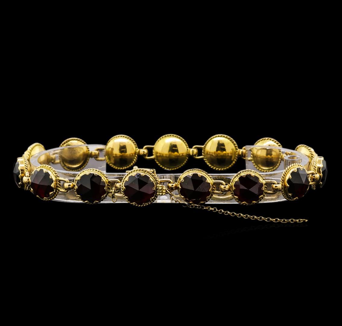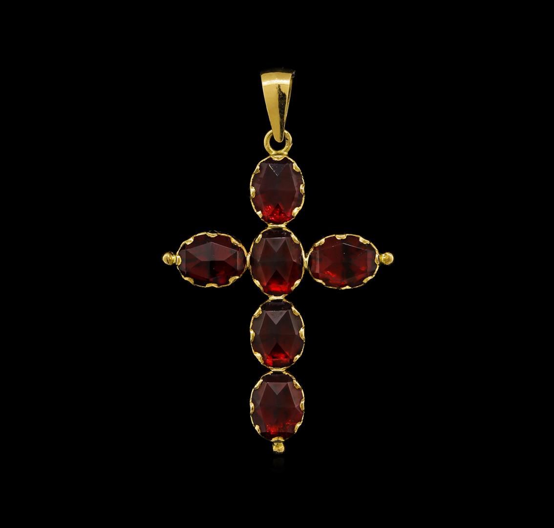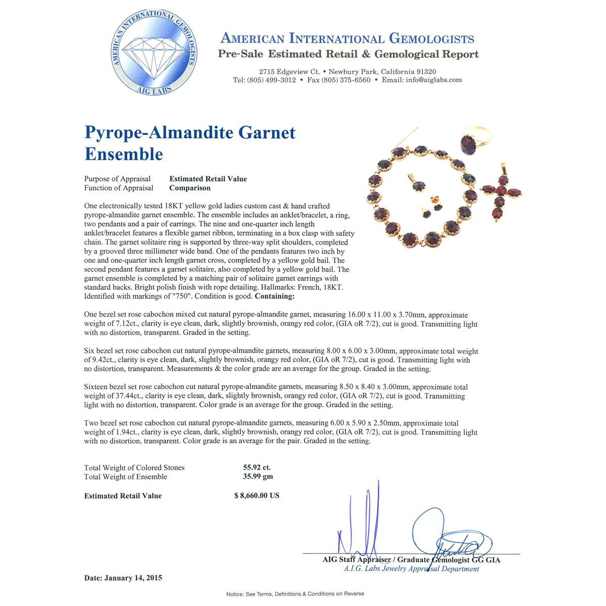 One electronically tested 18KT yellow gold ladies custom cast & hand crafted pyrope-almandite garnet ensemble. The ensemble includes an anklet/bracelet, a ring, two pendants and a pair of earrings. The nine and one-quarter inch length anklet/bracelet features a flexible garnet ribbon, terminating in a box clasp with safety chain. The garnet solitaire ring is supported by three-way split shoulders, completed by a grooved three millimeter wide band. One of the pendants features two inch by one and one-quarter inch length garnet cross, completed by a yellow gold bail. The second pendant features a garnet solitaire, also completed by a yellow gold bail. The garnet ensemble is completed by a matching pair of solitaire garnet earrings with standard backs. Bright polish finish with rope detailing. Hallmarks: French, 18KT. Identified with markings of "750". Condition is good. Containing: One bezel set rose cabochon mixed cut natural pyrope-almandite garnet, measuring 16.00 x 11.00 x 3.70mm, approximate weight of 7.12ct., clarity is eye clean, dark, slightly brownish, orangy red color, (GIA oR 7/2), cut is good. Transmitting light with no distortion, transparent. Graded in the setting. Six bezel set rose cabochon cut natural pyrope-almandite garnets, measuring 8.00 x 6.00 x 3.00mm, approximate total weight of 9.42ct., clarity is eye clean, dark, slightly brownish, orangy red color, (GIA oR 7/2), cut is good. Transmitting light with no distortion, transparent. Measurements & the color grade are an average for the group. Graded in the setting. Sixteen bezel set rose cabochon cut natural pyrope-almandite garnets, measuring 8.50 x 8.40 x 3.00mm, approximate total weight of 37.44ct., clarity is eye clean, dark, slightly brownish, orangy red color, (GIA oR 7/2), cut is good. Transmitting light with no distortion, transparent. Color grade is an average for the group. Graded in the setting. Two bezel set rose cabochon cut natural pyrope-almandite garnets, measuring 6.00 x 5.90 x 2.50mm, approximate total weight of 1.94ct., clarity is eye clean, dark, slightly brownish, orangy red color, (GIA oR 7/2), cut is good. Transmitting light with no distortion, transparent. Color grade is an average for the pair. Graded in the setting. Total Weight of Colored Stones 55.92ct. Total Weight of Ensemble 35.99 grams. AIG Appraised at $8,660.00.