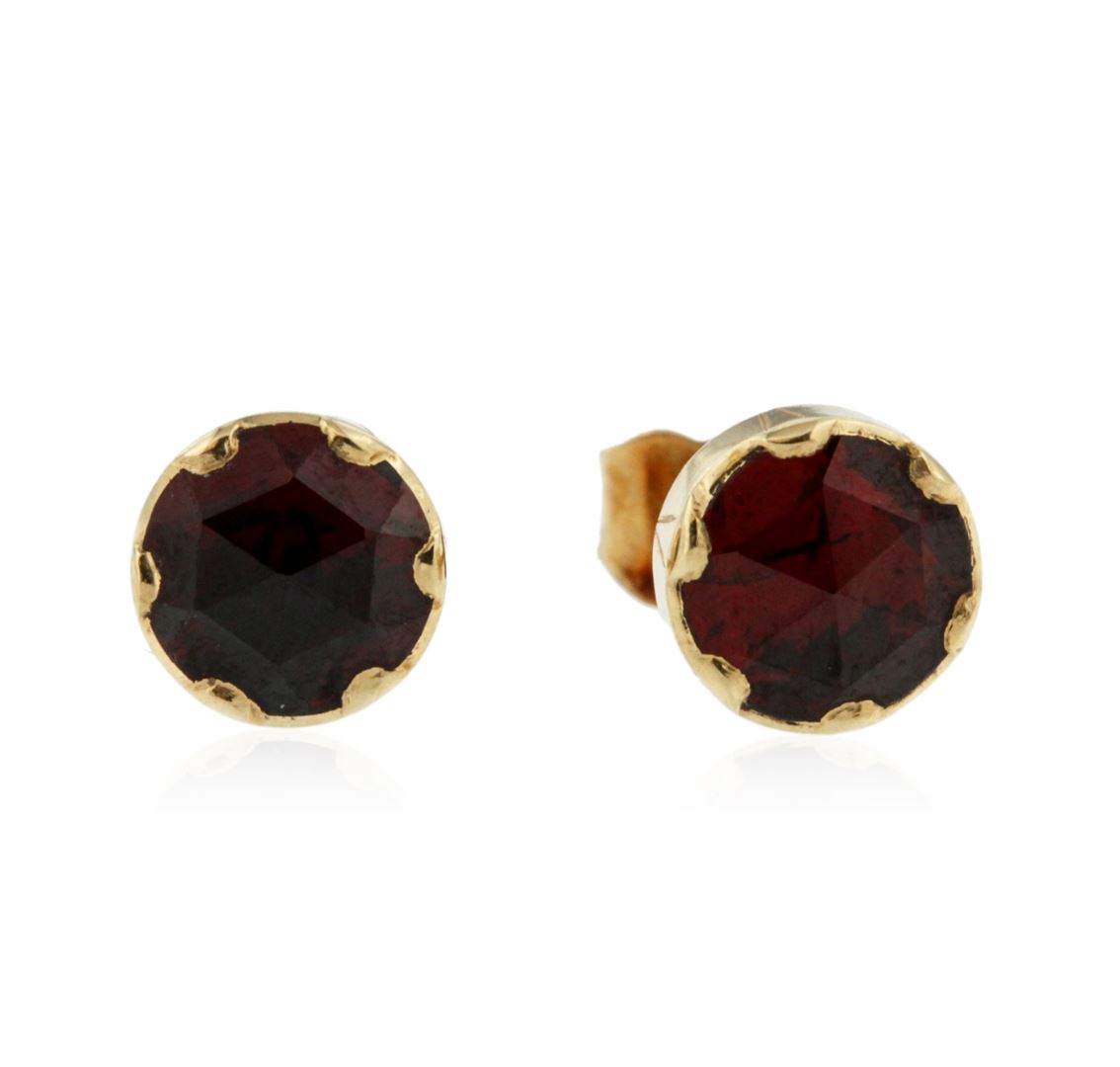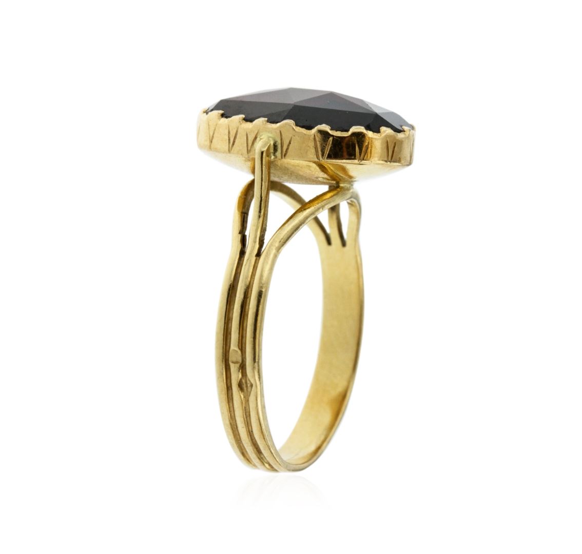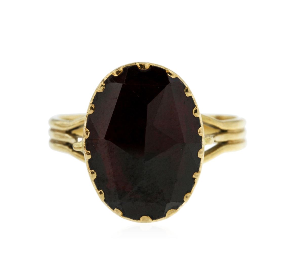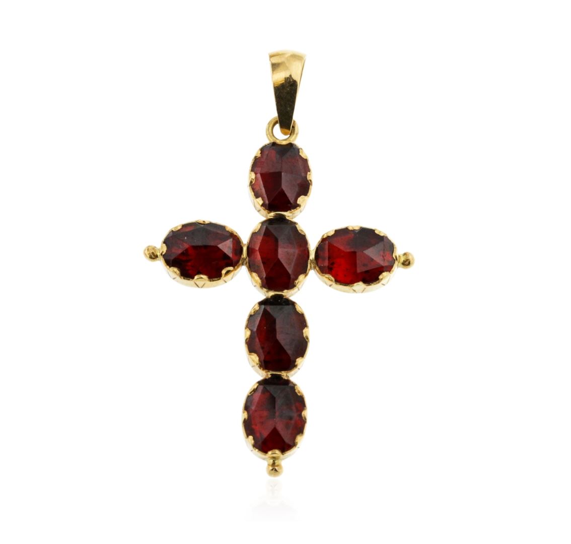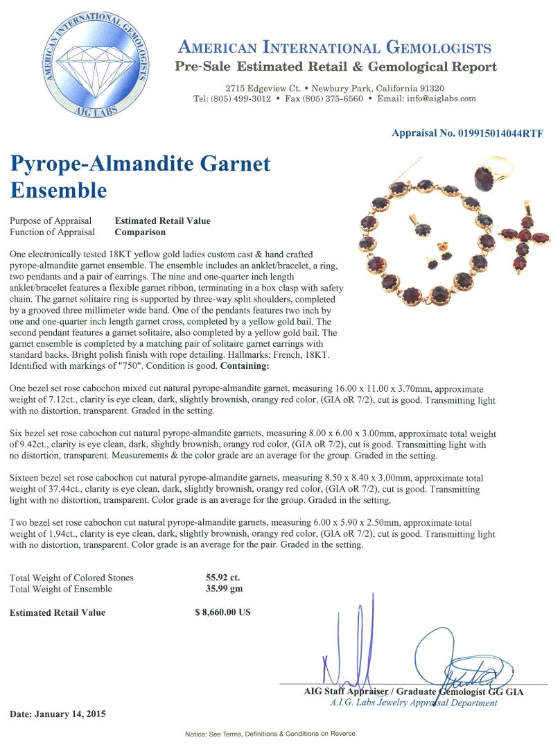 One electronically tested 18KT yellow gold ladies custom cast & hand crafted pyrope-almandite garnet ensemble. The ensemble includes an anklet/bracelet, a ring, two pendants and a pair of earrings. The nine and one-quarter inch length anklet/bracelet features a flexible garnet ribbon, terminating in a box clasp with safety chain. The garnet solitaire ring is supported by three-way split shoulders, completed by a grooved three millimeter wide band. One of the pendants features two inch by one and one-quarter inch length garnet cross, completed by a yellow gold bail. The second pendant features a garnet solitaire, also completed by a yellow gold bail. The garnet ensemble is completed by a matching pair of solitaire garnet earrings with standard backs. Bright polish finish with rope detailing. Hallmarks: French, 18KT. Identified with markings of "750". Condition is good. Containing: One bezel set rose cabochon mixed cut natural pyrope-almandite garnet, measuring 16.00 x 11.00 x 3.70mm, approximate weight of 7.12ct., clarity is eye clean, dark, slightly brownish, orangy red color, (GIA oR 7/2), cut is good. Transmitting light with no distortion, transparent. Graded in the setting. Six bezel set rose cabochon cut natural pyrope-almandite garnets, measuring 8.00 x 6.00 x 3.00mm, approximate total weight of 9.42ct., clarity is eye clean, dark, slightly brownish, orangy red color, (GIA oR 7/2), cut is good. Transmitting light with no distortion, transparent. Measurements & the color grade are an average for the group. Graded in the setting. Sixteen bezel set rose cabochon cut natural pyrope-almandite garnets, measuring 8.50 x 8.40 x 3.00mm, approximate total weight of 37.44ct., clarity is eye clean, dark, slightly brownish, orangy red color, (GIA oR 7/2), cut is good. Transmitting light with no distortion, transparent. Color grade is an average for the group. Graded in the setting. Two bezel set rose cabochon cut natural pyrope-almandite garnets, measuring 6.00 x 5.90 x 2.50mm, approximate total weight of 1.94ct., clarity is eye clean, dark, slightly brownish, orangy red color, (GIA oR 7/2), cut is good. Transmitting light with no distortion, transparent. Color grade is an average for the pair. Graded in the setting. Total Weight of Colored Stones 55.92ct. Total Weight of Ensemble 35.99 grams. AIG Appraised at $8,660.00.