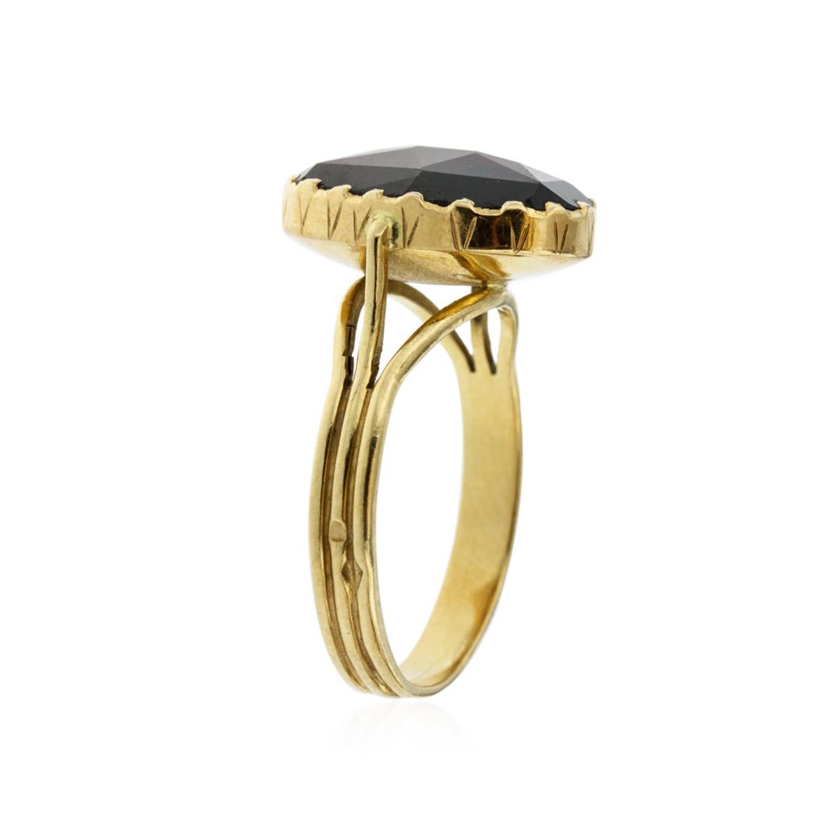 One electronically tested 18KT yellow gold ladies custom cast & hand crafted pyrope-almandite garnet ensemble. The ensemble includes an anklet/bracelet, a ring, two pendants and a pair of earrings. The nine and one-quarter inch length anklet/bracelet features a flexible garnet ribbon, terminating in a box clasp with safety chain. The garnet solitaire ring is supported by three-way split shoulders, completed by a grooved three millimeter wide band. One of the pendants features two inch by one and one-quarter inch length garnet cross, completed by a yellow gold bail. The second pendant features a garnet solitaire, also completed by a yellow gold bail. The garnet ensemble is completed by a matching pair of solitaire garnet earrings with standard backs. Bright polish finish with rope detailing. Hallmarks: French, 18KT. Identified with markings of "750". Condition is good. Containing: One bezel set rose cabochon mixed cut natural pyrope-almandite garnet, measuring 16.00 x 11.00 x 3.70mm, approximate weight of 7.12ct., clarity is eye clean, dark, slightly brownish, orangy red color, (GIA oR 7/2), cut is good. Transmitting light with no distortion, transparent. Graded in the setting. Six bezel set rose cabochon cut natural pyrope-almandite garnets, measuring 8.00 x 6.00 x 3.00mm, approximate total weight of 9.42ct., clarity is eye clean, dark, slightly brownish, orangy red color, (GIA oR 7/2), cut is good. Transmitting light with no distortion, transparent. Measurements & the color grade are an average for the group. Graded in the setting. Sixteen bezel set rose cabochon cut natural pyrope-almandite garnets, measuring 8.50 x 8.40 x 3.00mm, approximate total weight of 37.44ct., clarity is eye clean, dark, slightly brownish, orangy red color, (GIA oR 7/2), cut is good. Transmitting light with no distortion, transparent. Color grade is an average for the group. Graded in the setting. Two bezel set rose cabochon cut natural pyrope-almandite garnets, measuring 6.00 x 5.90 x 2.50mm, approximate total weight of 1.94ct., clarity is eye clean, dark, slightly brownish, orangy red color, (GIA oR 7/2), cut is good. Transmitting light with no distortion, transparent. Color grade is an average for the pair. Graded in the setting. Total Weight of Colored Stones 55.92ct. Total Weight of Ensemble 35.99 grams. AIG Appraised at $8,660.00.