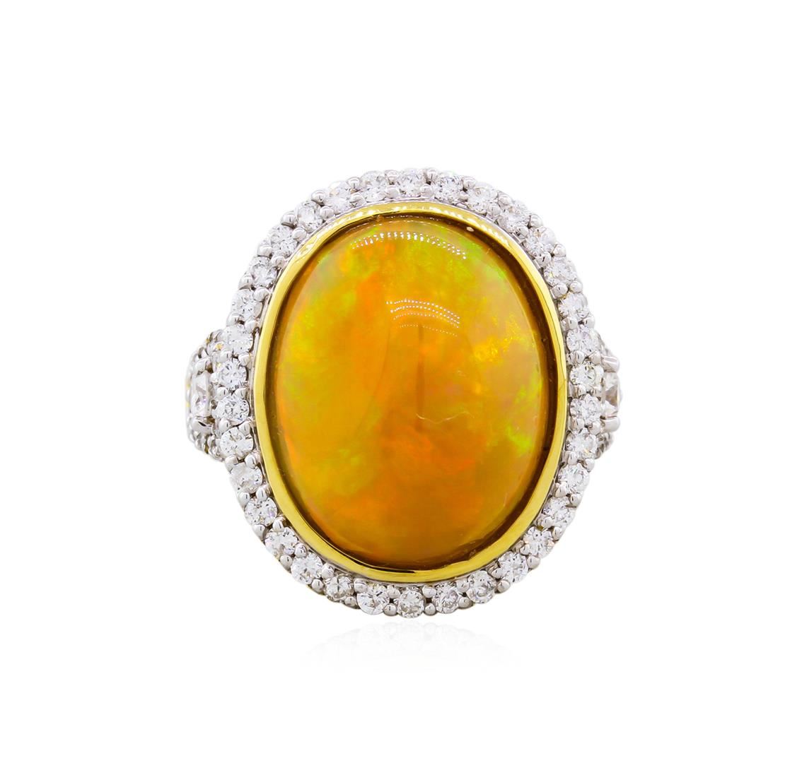 One stunning opal and diamond ring set in 18KT yellow gold weighing 8.60 grams containing a 7.87 carat oval shaped opal center stone beautifully showcased by 1.02 carats of round diamonds which extend down both sides of the band.