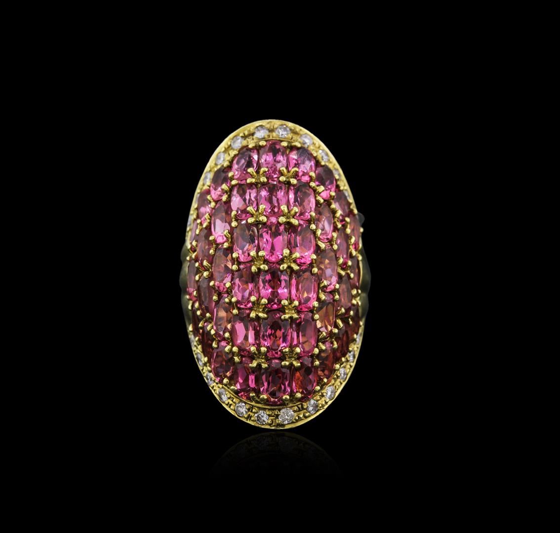 One electronically tested 18KT yellow gold ladies cast tourmaline and diamond ring with a bright polish finish. Identified with markings of "18K". Condition is new. Containing: Forty-four prong set oval modified brilliant cut natural pink tourmalines, measuring 5.00 x 3.00 x 1.95mm, approximate total weight of 8.36ct., clarity is eye clean, type II, medium light, slightly grayish, reddish purple color, (GIA rP 4/2), cut is good. Twenty-Four prong set round brilliant cut diamonds, measuring 1.50 - 1.50 x 0.90mm (depth est.) approximate total weight of 24 Stones = 0.30ct. Clarity: SI-1 to I-1. Color: H - I, Cut is Good. All diamonds and colored gemstones are graded in the mounting, unless otherwise stated. Colored gemstones are presumed to have been subjected to commonly used enhancement processes. Total Weight of Colored Stones 8.36ct. Total Weight of Diamonds 0.30ct. Total Weight of Ring 16.90 grams.