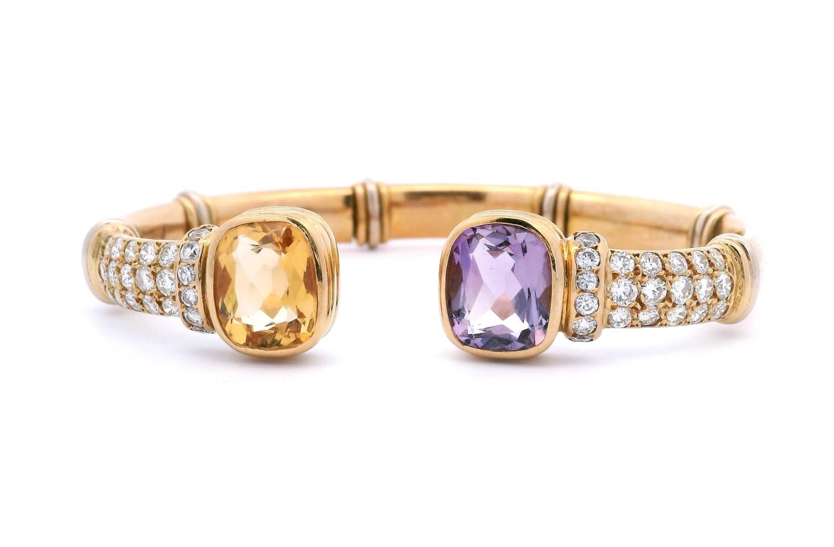 This vibrant 18KT yellow gold cuff bangle bracelet showcases two bezel-set rectangular cushion-cut gemstones: a 3.70-carat amethyst and a 3.71-carat citrine quartz. Complemented by 42 round brilliant cut diamonds totaling 1.85 carats, the 6 1/2-inch bracelet features a bright polished finish, offering a unique combination of color and elegance. Estimated Retail Value: $14,800.