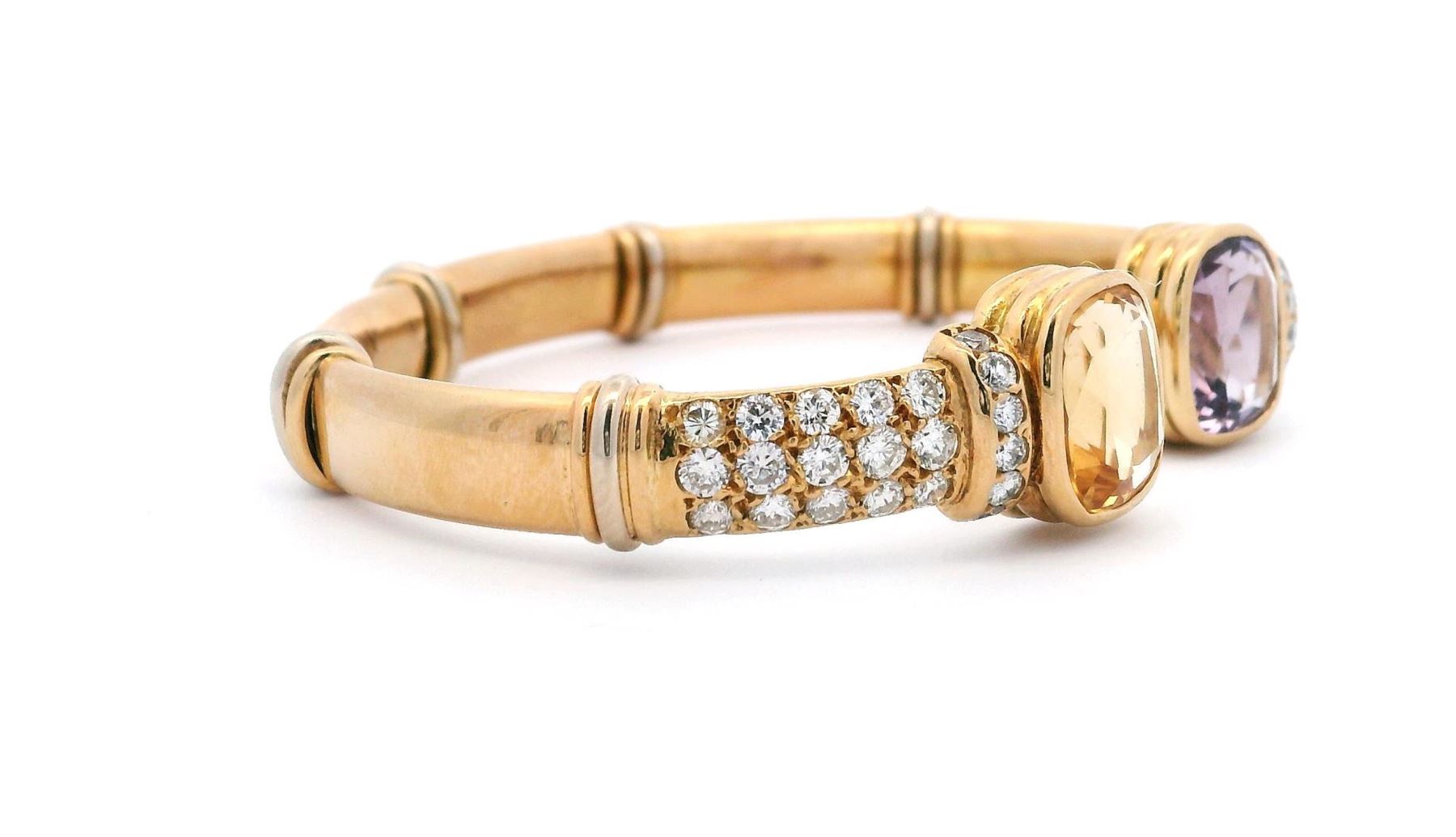 This vibrant 18KT yellow gold cuff bangle bracelet showcases two bezel-set rectangular cushion-cut gemstones: a 3.70-carat amethyst and a 3.71-carat citrine quartz. Complemented by 42 round brilliant cut diamonds totaling 1.85 carats, the 6 1/2-inch bracelet features a bright polished finish, offering a unique combination of color and elegance. Estimated Retail Value: $14,800.