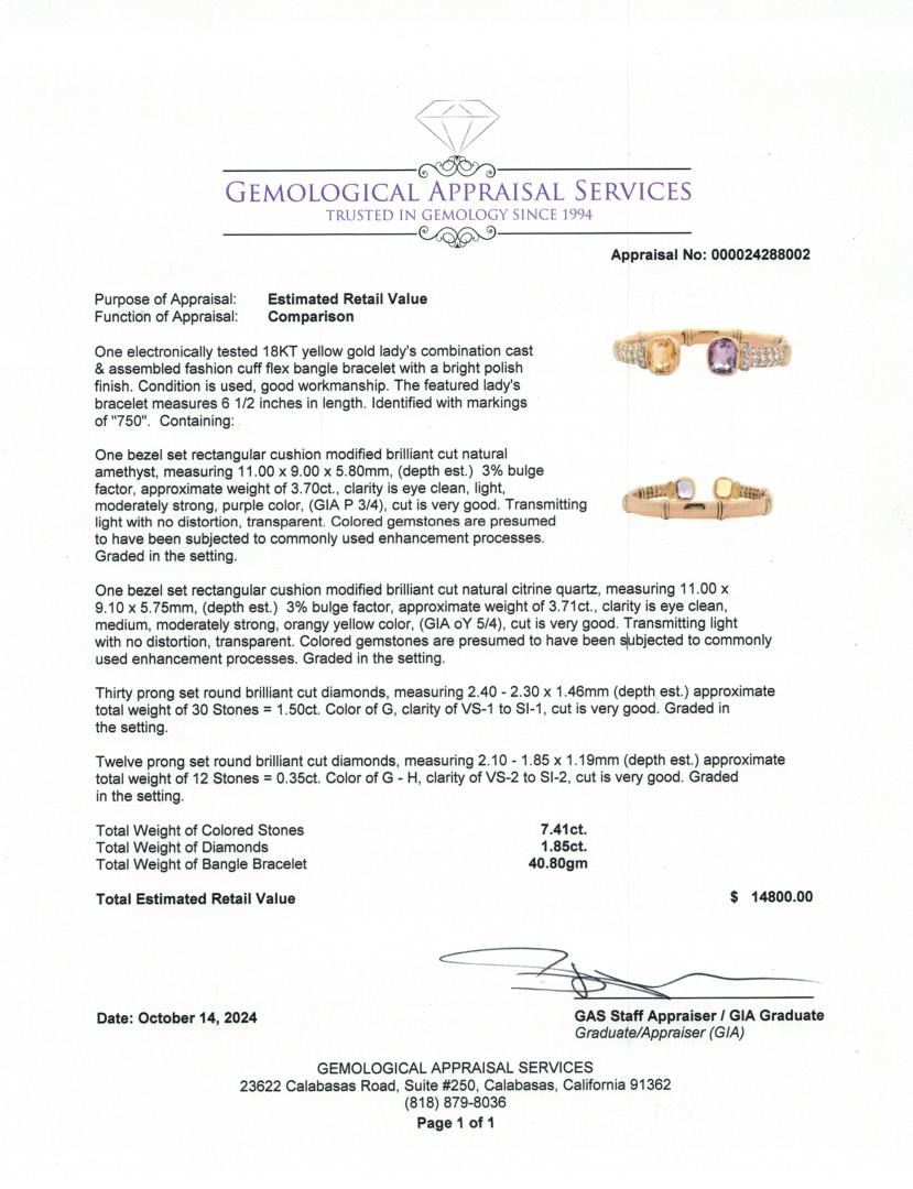 This vibrant 18KT yellow gold cuff bangle bracelet showcases two bezel-set rectangular cushion-cut gemstones: a 3.70-carat amethyst and a 3.71-carat citrine quartz. Complemented by 42 round brilliant cut diamonds totaling 1.85 carats, the 6 1/2-inch bracelet features a bright polished finish, offering a unique combination of color and elegance. Estimated Retail Value: $14,800.