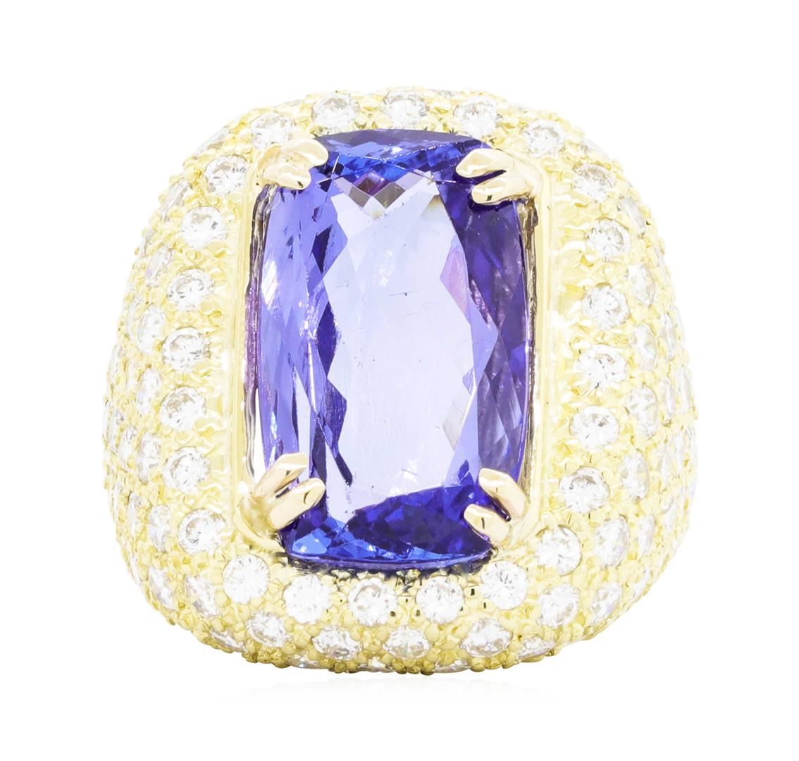 One electronically tested 18KT yellow gold Ladies cast fashion ring with a pave gypsy mounting with a bright polish finish. The featured Ladies ring has a shank measuring 3.00 millimeters wide. Identified with markings of '18K'. Condition is like new, good workmanship. Containing: One prong set rectangular cushion modified step cut natural tanzanite, measuring 17.38 x 10.80 x 6.05mm, (depth est.) 10%. bulge factor, approximate weight of 9.83ct., clarity is eye clean, medium light, moderately strong, bluish violet color, (GIA bV 4/4), cut is good. Transmitting light with no distortion, transparent. Colored gemstones are presumed to have been subjected to commonly used enhancement processes. Graded in the setting. One Hundred Ten prong set round brilliant cut diamonds, measuring 2.00 - 1.90 x 1.17mm (depth est.) approximate total weight of 110 Stones = 3.00ct. Graded in the setting. Color G - H Clarity VS-2 to SI-1 Cut Very Good. Total Weight of Colored Stones 9.83ct. Total Weight of Diamonds 3.00ct. Total Weight of Ring 16.60gm. GAS Appraised.