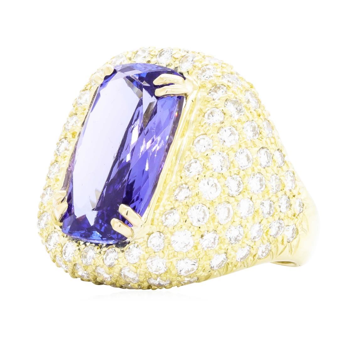 One electronically tested 18KT yellow gold Ladies cast fashion ring with a pave gypsy mounting with a bright polish finish. The featured Ladies ring has a shank measuring 3.00 millimeters wide. Identified with markings of '18K'. Condition is like new, good workmanship. Containing: One prong set rectangular cushion modified step cut natural tanzanite, measuring 17.38 x 10.80 x 6.05mm, (depth est.) 10%. bulge factor, approximate weight of 9.83ct., clarity is eye clean, medium light, moderately strong, bluish violet color, (GIA bV 4/4), cut is good. Transmitting light with no distortion, transparent. Colored gemstones are presumed to have been subjected to commonly used enhancement processes. Graded in the setting. One Hundred Ten prong set round brilliant cut diamonds, measuring 2.00 - 1.90 x 1.17mm (depth est.) approximate total weight of 110 Stones = 3.00ct. Graded in the setting. Color G - H Clarity VS-2 to SI-1 Cut Very Good. Total Weight of Colored Stones 9.83ct. Total Weight of Diamonds 3.00ct. Total Weight of Ring 16.60gm. GAS Appraised.