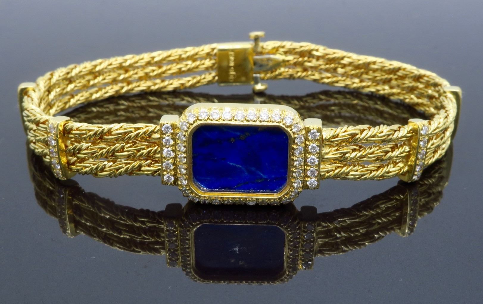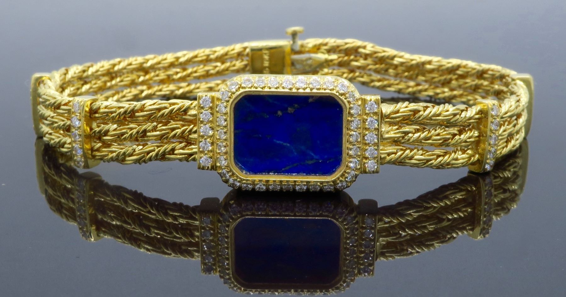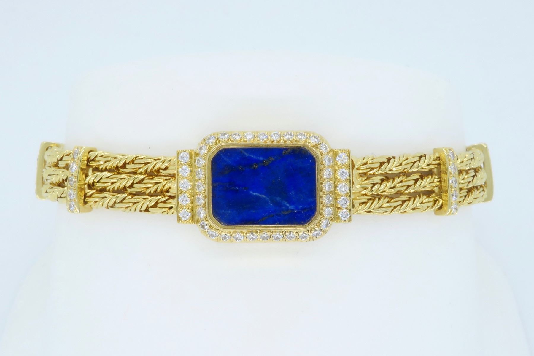 18KT Yellow Gold Baume & Mercier Diamond Bracelet. This custom 18KT Yellow Gold Baume & Mercier bracelet was created from a Baume & Mercier watch. The bracelet features an approximately 11.45 x 9.15mm Custom Cut Lapis Lazuli. There are 62 Round Brilliant Cut Diamonds accenting the featured gemstone. There is approximately .50CTW of diamonds in this bracelet. The diamonds display an average G-I color and average VS clarity. The bracelet measures 6.75” in length and weighs 24.0 grams. The bracelet is stamped “18K ags” and “18494 950 1358912”.