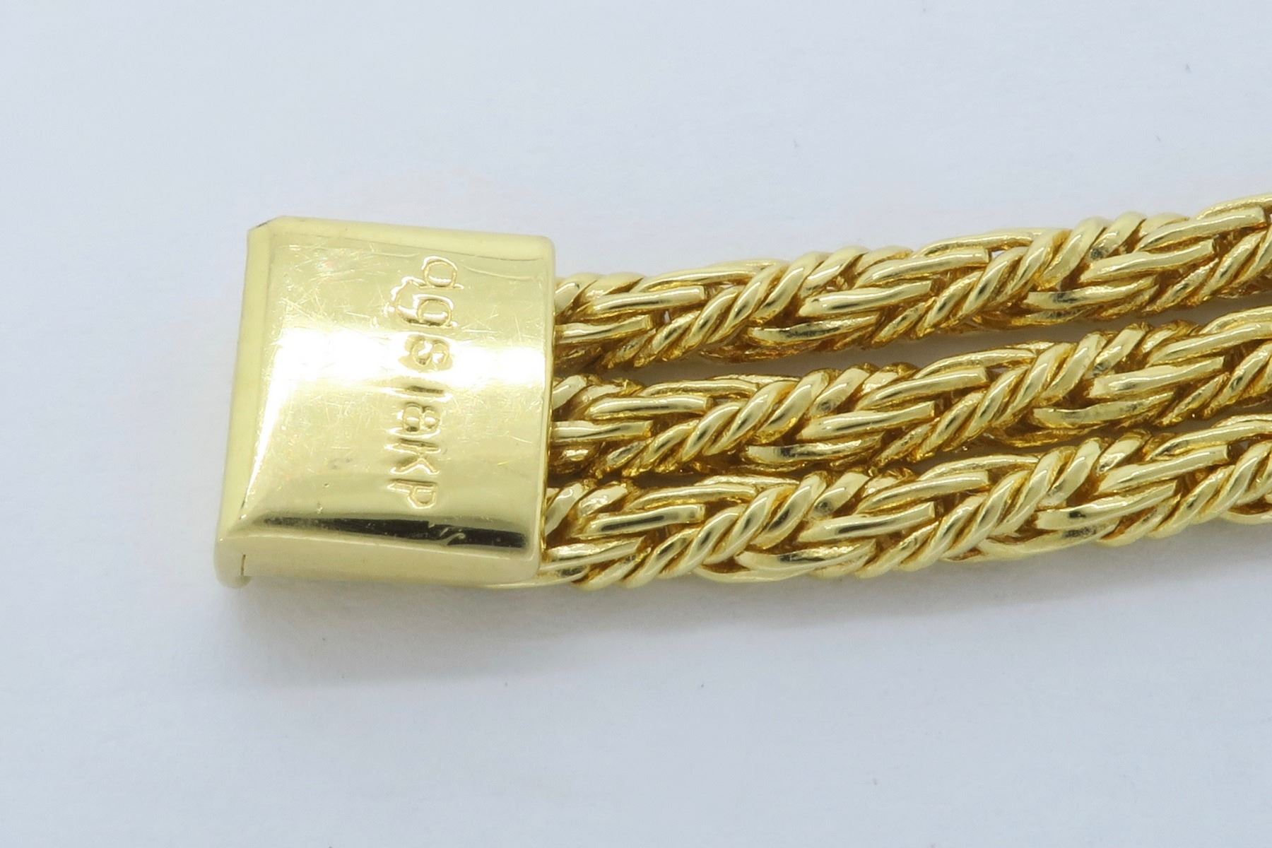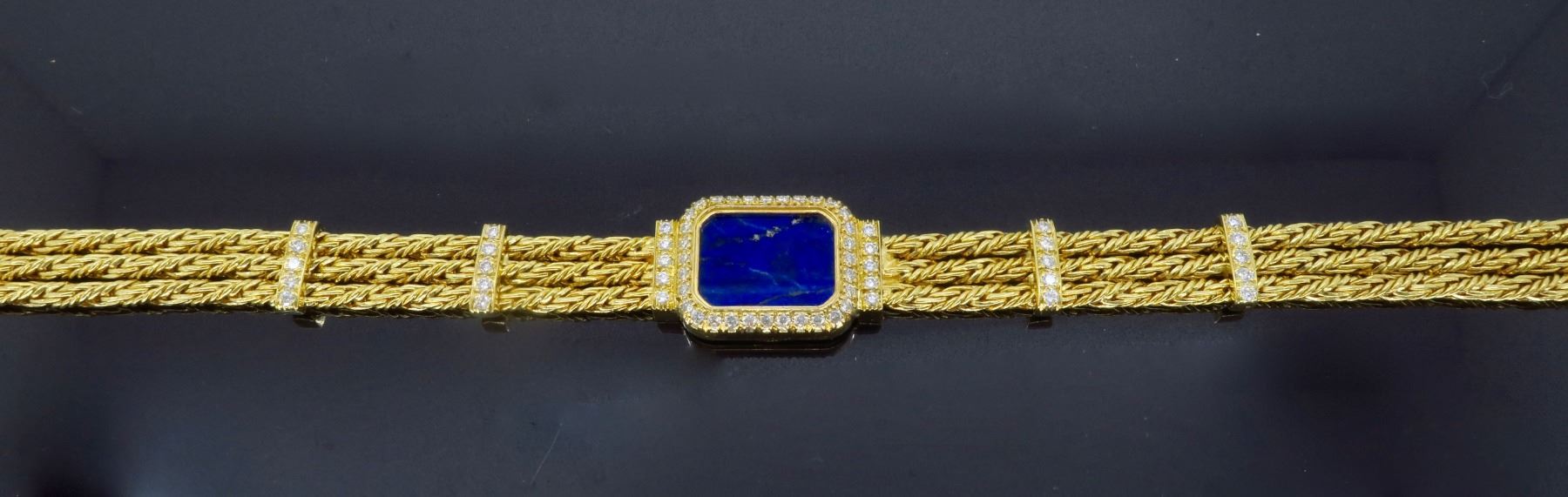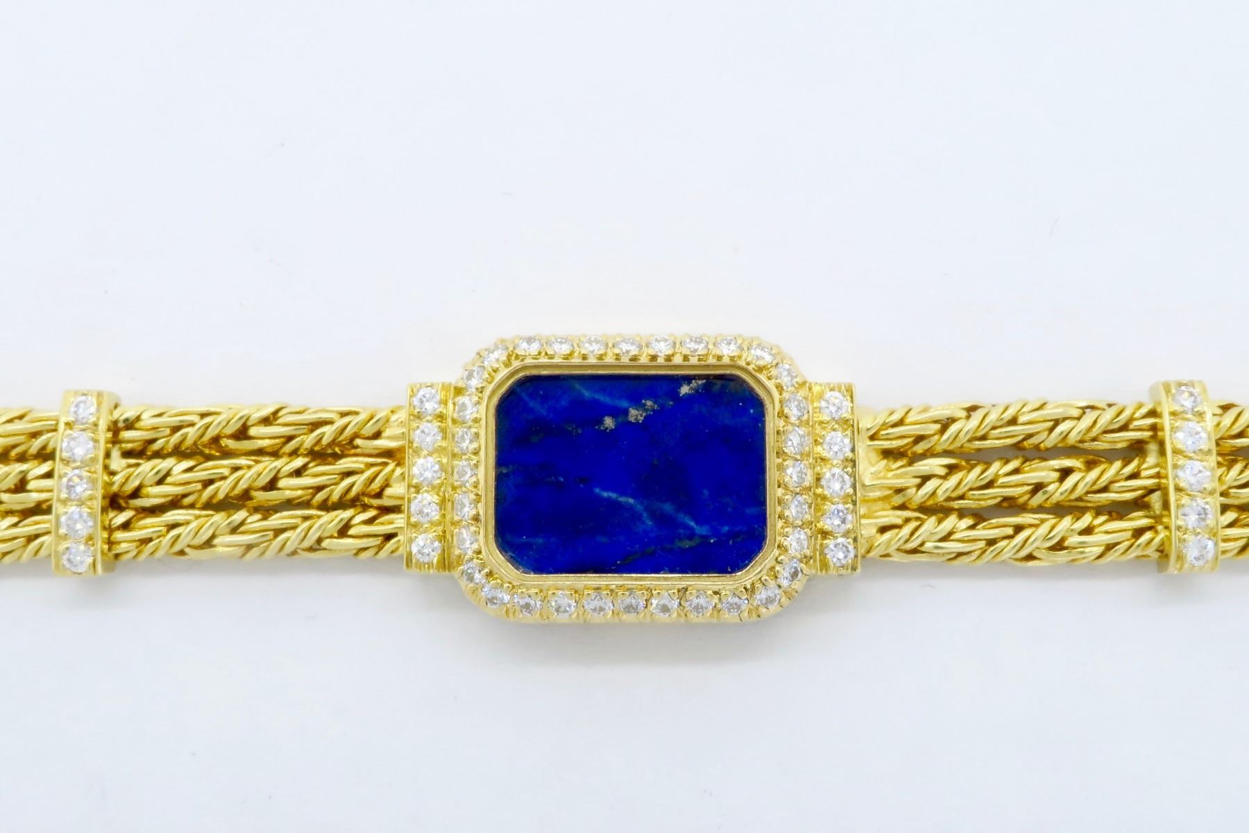18KT Yellow Gold Baume & Mercier Diamond Bracelet. This custom 18KT Yellow Gold Baume & Mercier bracelet was created from a Baume & Mercier watch. The bracelet features an approximately 11.45 x 9.15mm Custom Cut Lapis Lazuli. There are 62 Round Brilliant Cut Diamonds accenting the featured gemstone. There is approximately .50CTW of diamonds in this bracelet. The diamonds display an average G-I color and average VS clarity. The bracelet measures 6.75” in length and weighs 24.0 grams. The bracelet is stamped “18K ags” and “18494 950 1358912”.