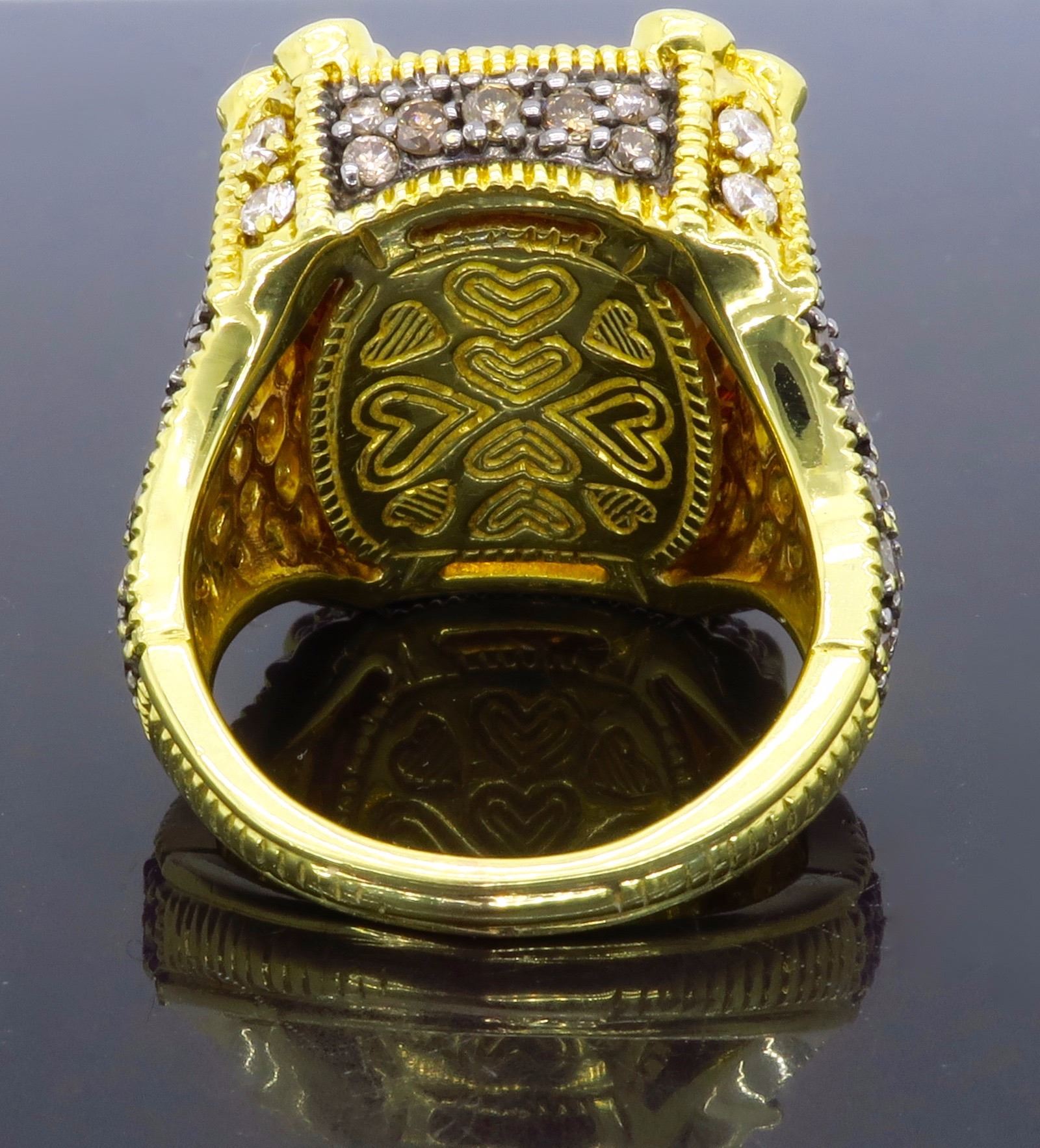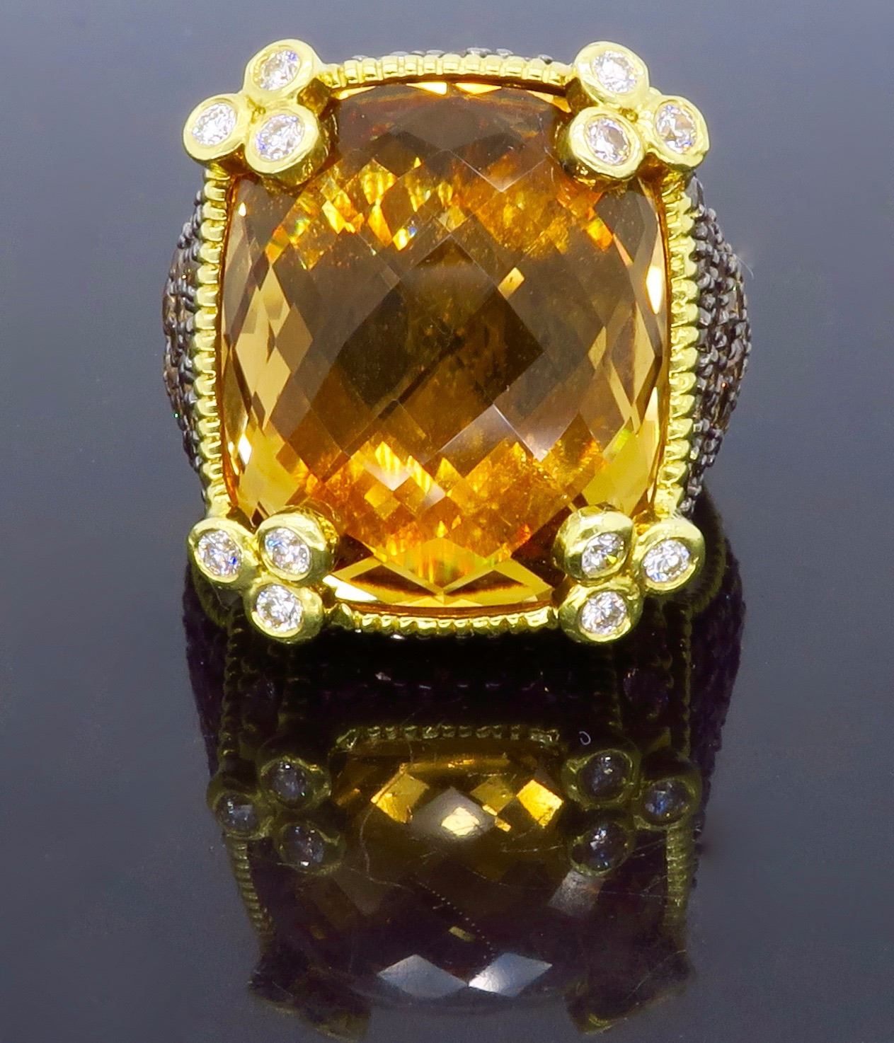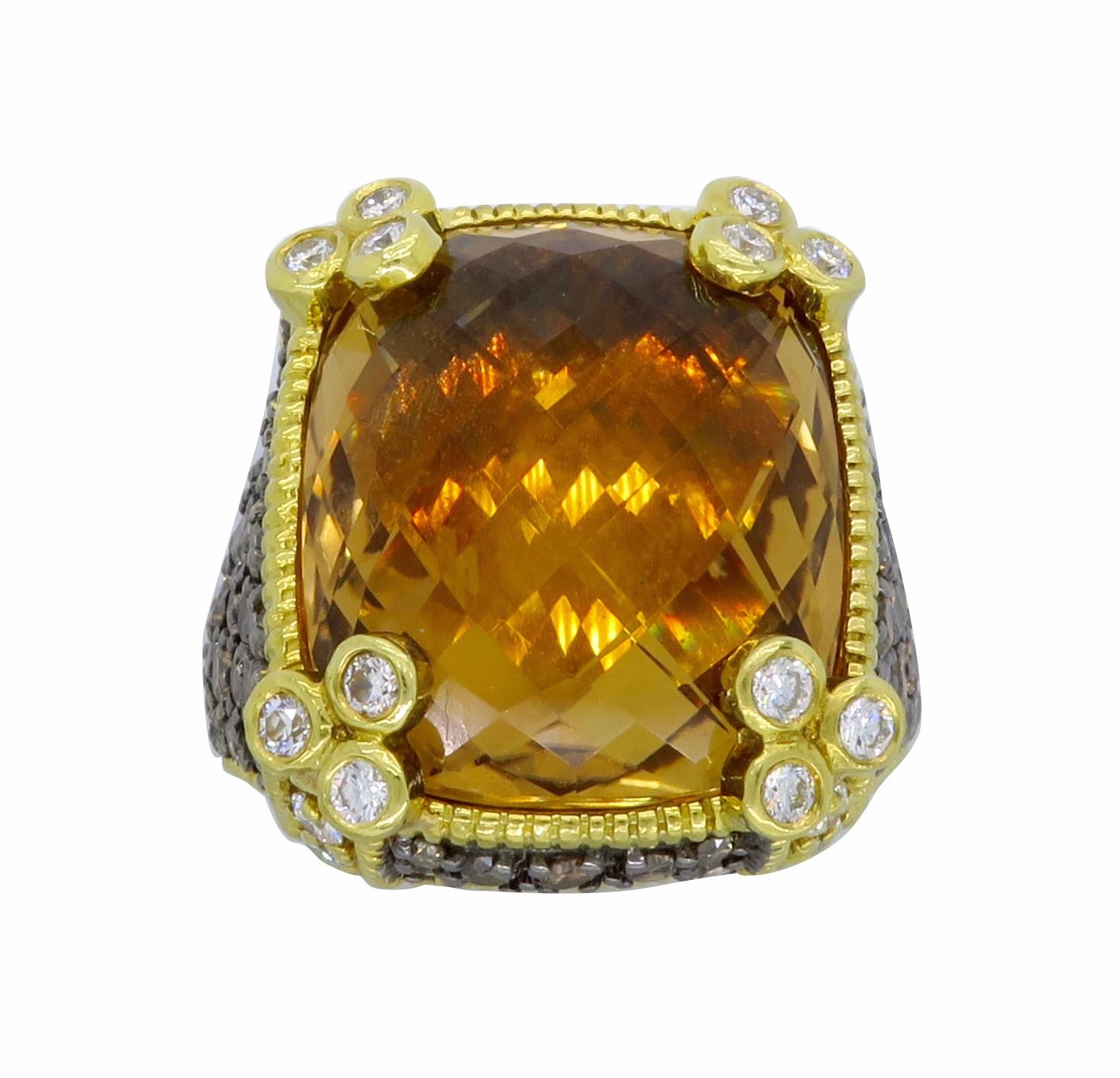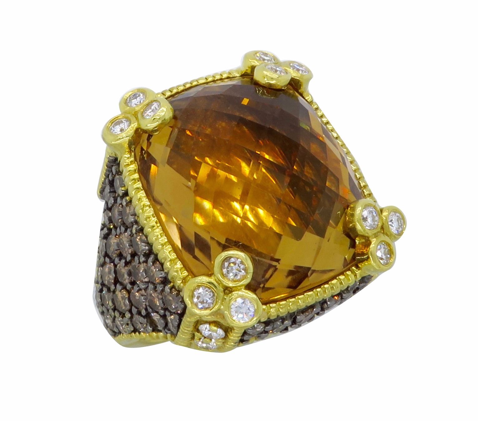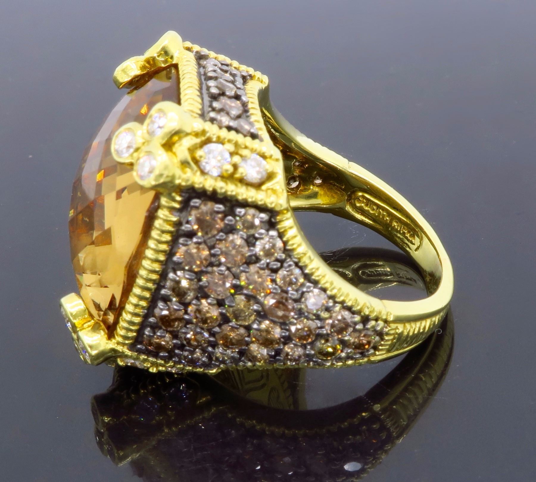 18KT Yellow Gold Champagne Quartz and Diamond Ring. (1) Champagne Quartz measuring 17.5mm by 15mm. 2.05cts of Diamonds. Chocolate diamond with a clarity of SI-2 to I-1. Ring was designed by Judith Ripka. Total weight of this ring is 18.4 grams.