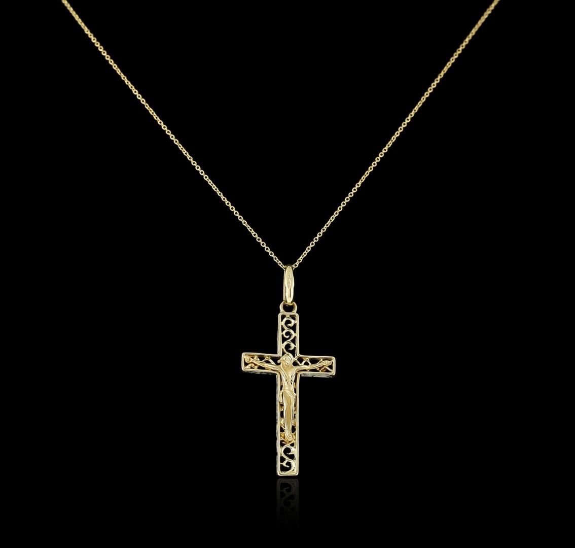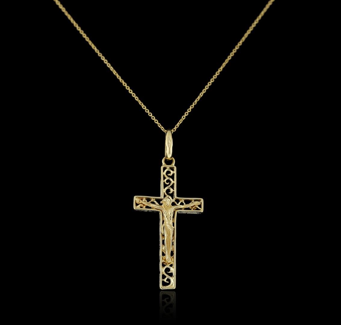 One cross pendant with chain featuring: 18KT yellow gold weighing 5.85 grams.