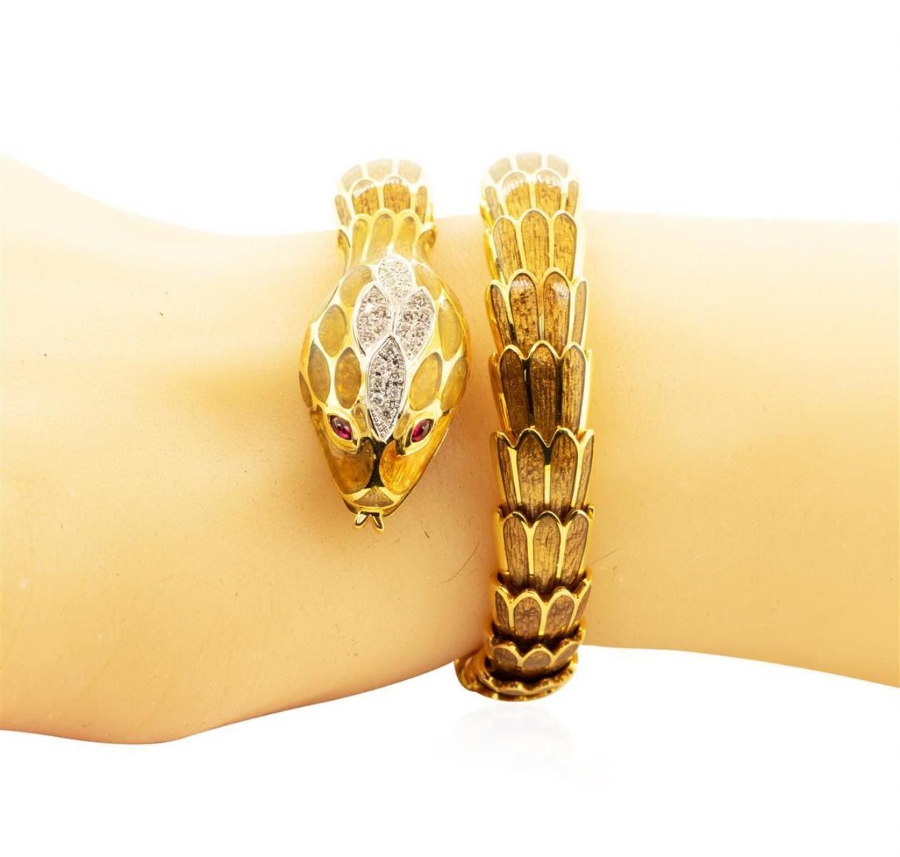 One electronically tested 18KT yellow and white gold lady's David Webb combination cast & assembled fashion designer flexable bangle braclet with a enameled snake motif with a bright polish finish. Condition is like new, good workmanship. The featured lady's flexable bangle bracelet has a identifacation number: 81221 Trademark is DAVID WEBB. Identified with markings of "750". Containing: Two bezel set marquise standard cut natural ruby-cabochons, measuring 3.50 x 1.80 x 1.17mm, (depth est.) approximate total weight of 0.14ct., clarity is eye clean, medium dark, strong, red color, (GIA R 6/5), cut is very good. Colored gemstones are presumed to have been subjected to commonly used enhancement processes. Transmitting light with no distortion, transparent. Graded in the setting. Seventy-six bead set round brilliant cut diamonds, measuring 1.70 - 1.40 x 0.96mm (depth est.) approximate total weight of 76 Stones = 1.06ct. Graded in the setting. Color F - H Clarity VVS-2 to VS-2 Cut Excellent. Total Weight of Colored Stones 0.14ct. Total Weight of Diamonds: 1.06ct. Appraisal No: 000020245000