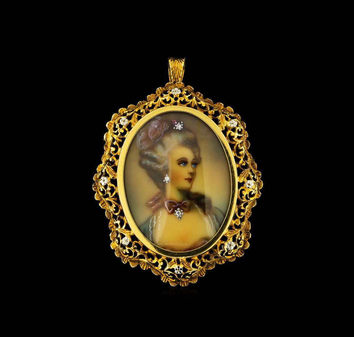 One electronically tested 18KT yellow gold ladies cast & assembled diamond brooch/pendant. The brooch/pendant features a hand painted profile of a Victorian woman. A single diamond accents her necklace, her earring and her hair piece. The portrait is set within an elaborate floral lace detailed bezel. The brooch/pendant is completed by a horizontally place pin and a hidden patterned bail. Bright polish finish with rhodium accents. Area measurements without bail 2.00 x 1.50 inch. Trademark is Corletto. Identified with markings of "K18". Condition is good. Containing: Three single cut diamonds, measuring 1.10 - 1.00 x 0.63mm (depth est.) approximate total weight of 3 Stones = 0.02ct. Graded in the setting. Clarity: VS-1 to VS-2. Color: G - H. Total Weight of Diamonds 0.02ct. Total Weight of Brooch/Pendant 12.79gm. AIG Appraised at $1,790.00.