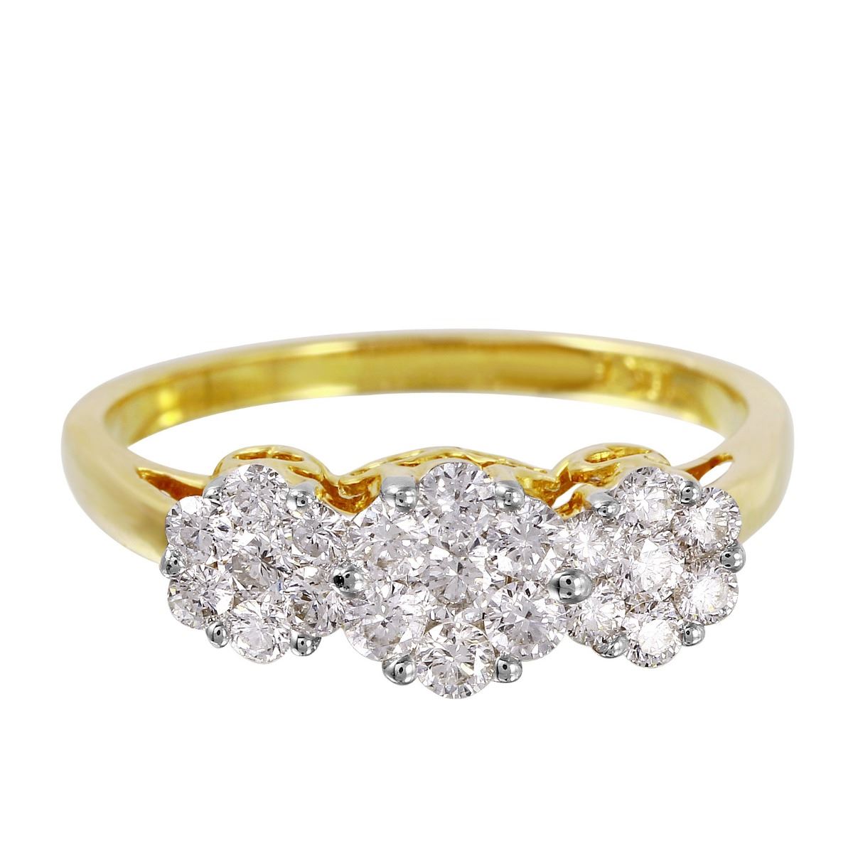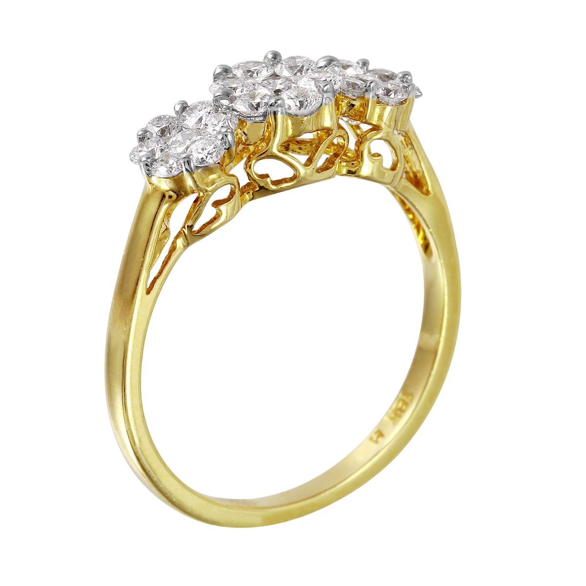 Three clusters of round brilliant cut diamonds adorn this brightly polished 18KT yellow gold ring, which tapers into a slim band.SpecificationsJewelry InformationCategory: RingCategory Style: PaveNew/Used: NewGender: FemaleRing Size: 7.5Metal: 18KT Yellow GoldTotal Weight: 3.03 GramsTotal Diamond Weight: 0.50ctwTotal Weight all Stones: 0.5ctwInternal ID:1590Diamond 1Total Carat Weight: 0.50ctwClarity: VS2-SI1Color: G-HShape: Round Brilliant CutCount: 21DisclaimersThe descriptions listed should not be construed as an appraisal. The detail is provided as a guideline for color, clarity, weights and measurements to the best of our ability. We welcome inspections. WE SHIP WORLDWIDE!This item has a Reserve established by our consigner.
